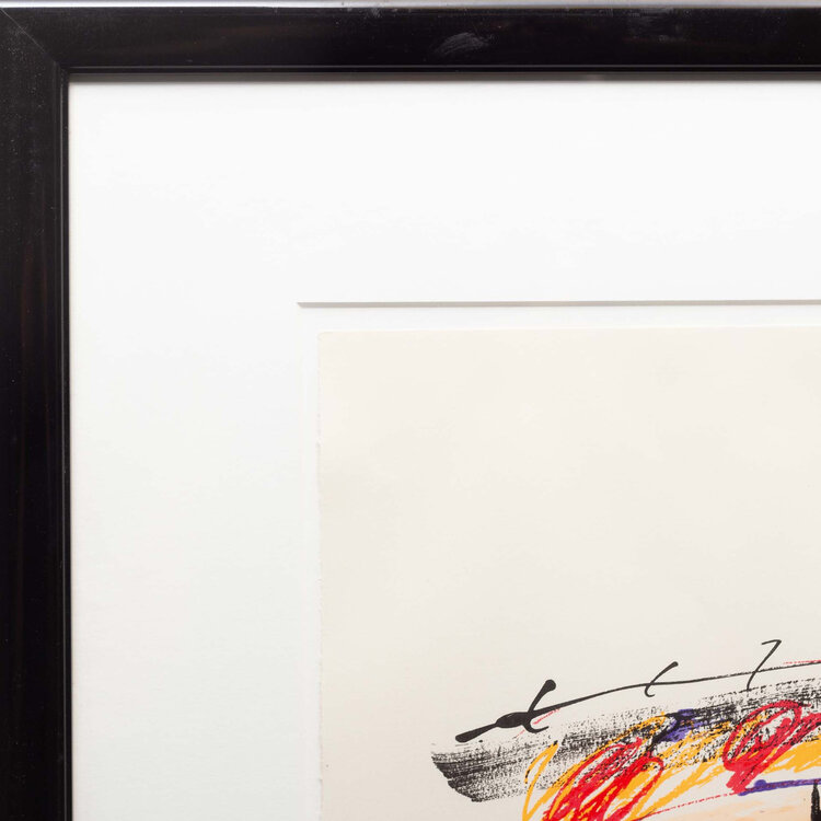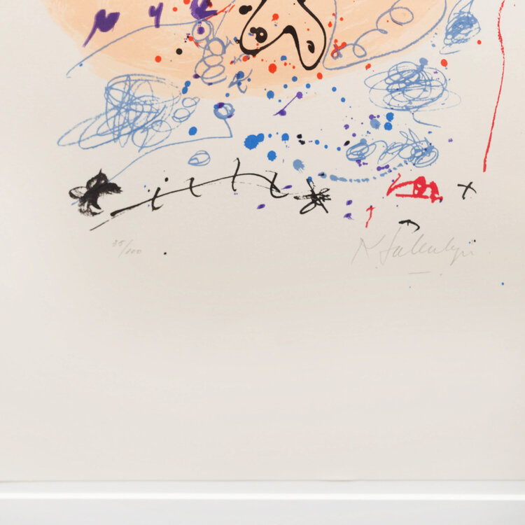 Kees Salentijn, Compositie, jaartal onbekend. Zeefdruk oplage 35/100. Abstracte voorstelling in zwart, rood, blauw, paars en geel. Linksonder oplagenummer, rechtsonder signatuur. Het werk is ingelijst in passe partout achter museumglas. Conditie: goed, enkel lichte gebruikssporen aan de lijst. Afmeting: 71 x 53 cm.