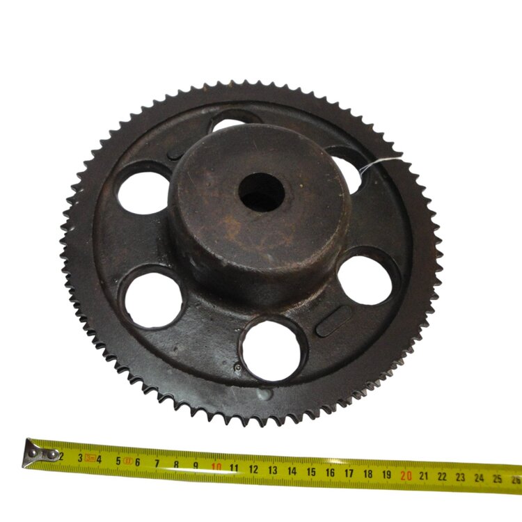 Ketting- of tandwielen van metaal, 3 stuks. 1 tandwiel heeft 6 ronde uitsparingen, de andere 2 hebben 4 uitsparingen. Datering: onbekend. Conditie: goed. Afmetingen 1e tandwiel: ca. 23,5 x 5,0 cm. 2e en 3e tandwiel: ca. 24,0 x 4,0 cm.