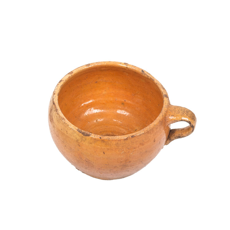 Kleine steelpan en kop met oor. Kleine steelpan van roodbakkend aardewerk. De steelpan heeft een ronde bak met schenklip, een korte steel en staat op drie poten. De pan is met glazuur waterdicht gemaakt. Steelpannen van roodbakkend aardewerk werden gebruikt van de 12e t/m de 18e eeuw; Bolvormige gegelazuurde kop van roodbakkend aardewerk met een oor. Het gaat vermoedelijk om een bodemvondst. Datering onbekend. Conditie: de pan is gerestaureerd, verspreid over de pan en kop zitten krassen en butsen, delen van het glazuur zijn verdwenen. Verder sporen van ouderdom en gebruik. Afmetingen steelpan: ca. 8 x 17 x 23 cm; Afmetingen kop: ca. 7 x 11 x 13 cm.
