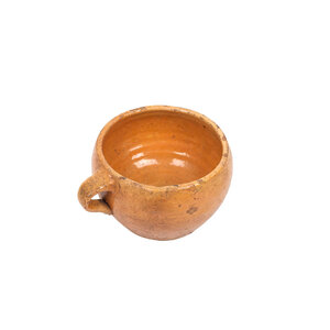 Kleine steelpan en kop met oor. Kleine steelpan van roodbakkend aardewerk. De steelpan heeft een ronde bak met schenklip, een korte steel en staat op drie poten. De pan is met glazuur waterdicht gemaakt. Steelpannen van roodbakkend aardewerk werden gebruikt van de 12e t/m de 18e eeuw; Bolvormige gegelazuurde kop van roodbakkend aardewerk met een oor. Het gaat vermoedelijk om een bodemvondst. Datering onbekend. Conditie: de pan is gerestaureerd, verspreid over de pan en kop zitten krassen en butsen, delen van het glazuur zijn verdwenen. Verder sporen van ouderdom en gebruik. Afmetingen steelpan: ca. 8 x 17 x 23 cm; Afmetingen kop: ca. 7 x 11 x 13 cm.