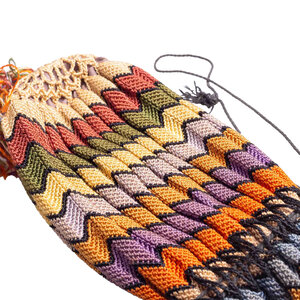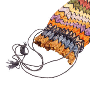 Kleurrijke met de hand gehaakte reticule. Het tasje heeft aan de onderzijde een kleurrijke franje en is gevoerd met paarse stof. Datering: 19e eeuw. Conditie: gebruikt, maar nog in erg goede conditie. Afmetingen ca.: 23 x 11 cm, hoogte incl. franje en hengsels is 48 cm.