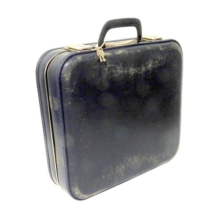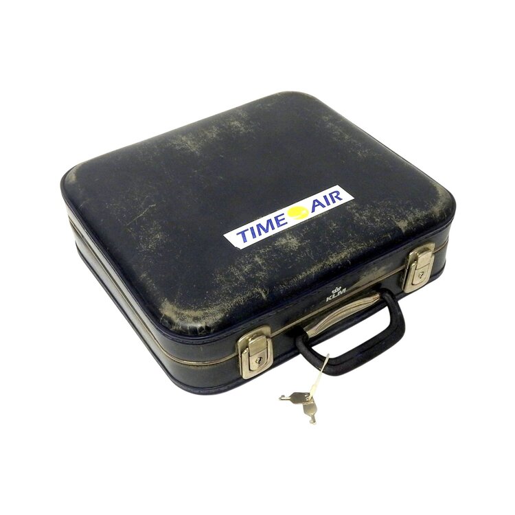 KLM stewardessenkoffer met bijbehorende sleutels. De buitenkant van de koffer is donkerblauw met witte letters KLM, de binnenkant is beige/grijs met een geometrisch patroon, het beslag is van metaal. Op de koffer zit een sticker met de tekst "Time air". Datering: vermoedelijk jaren 60, 20ste eeuw. Conditie: gebruikssporen, zoals slijtage. Afmetingen: 40 x 40 x 13 cm.