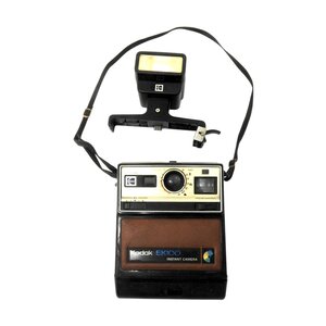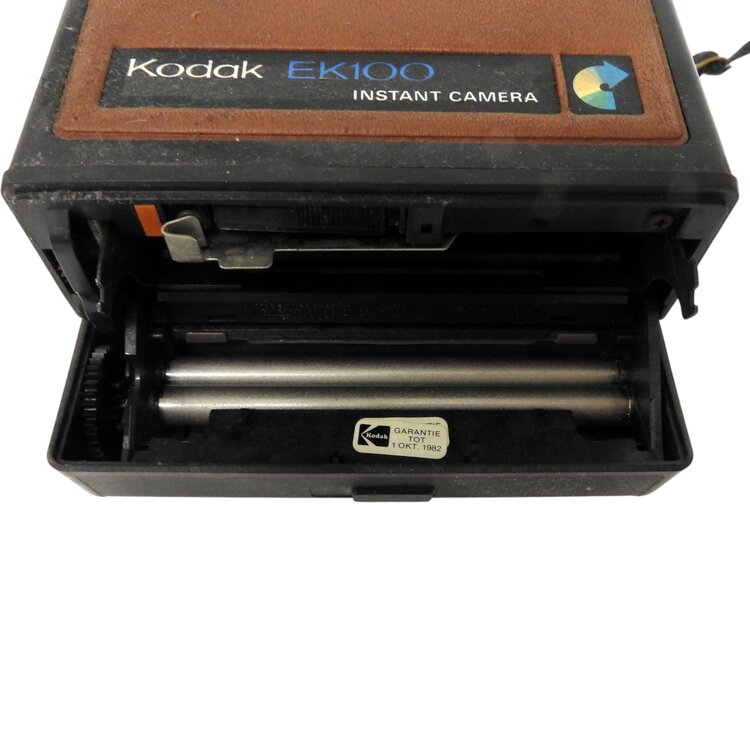 Kodak EK 100 instantcamera met electronenflitser. Bouwjaar 1976-1978. Kodak moest de camera's terug nemen uit de markt i.v.m. patentschending van Polaroid. Conditie: sporen van gebruik die passen bij de leeftijd van het item. Afmetingen: H. 26 cm (met flitser) / 16 cm (zonder flitser), Br. 13 cm, D. 10 cm.