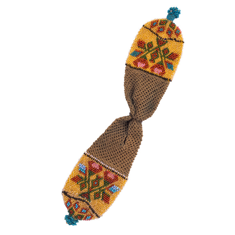 Kousenbeurs of lange beurs met kralenwerk, begin 19e eeuw. Deze beurs werd populair in het laatste kwart van de 18e eeuw, en werd gebruikt om geld in op te bergen. De beurs bevat twee uiteinden zodat de munten kunnen worden gesorteerd. De beurs heeft een geometrisch bloem patroon, maar is asymmetrisch, mogelijk om de verschillende kanten van de beurs beter uit elkaar te houden. Conditie: De tas is in zeer goede conditie. Aan de binnenkant van het gehaakte gedeelte kun je zien dat het middendeel oorspronkelijk donkergroen was. Afmetingen: 27 x 6 cm.