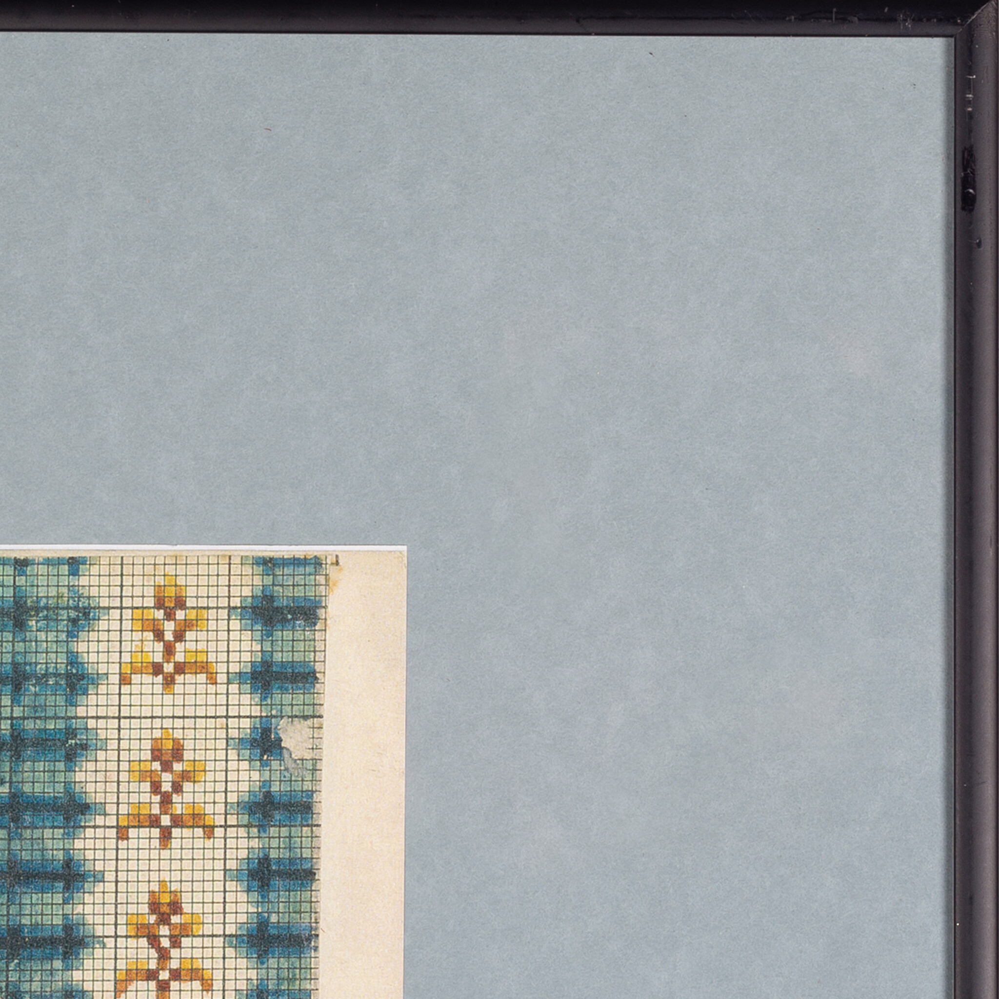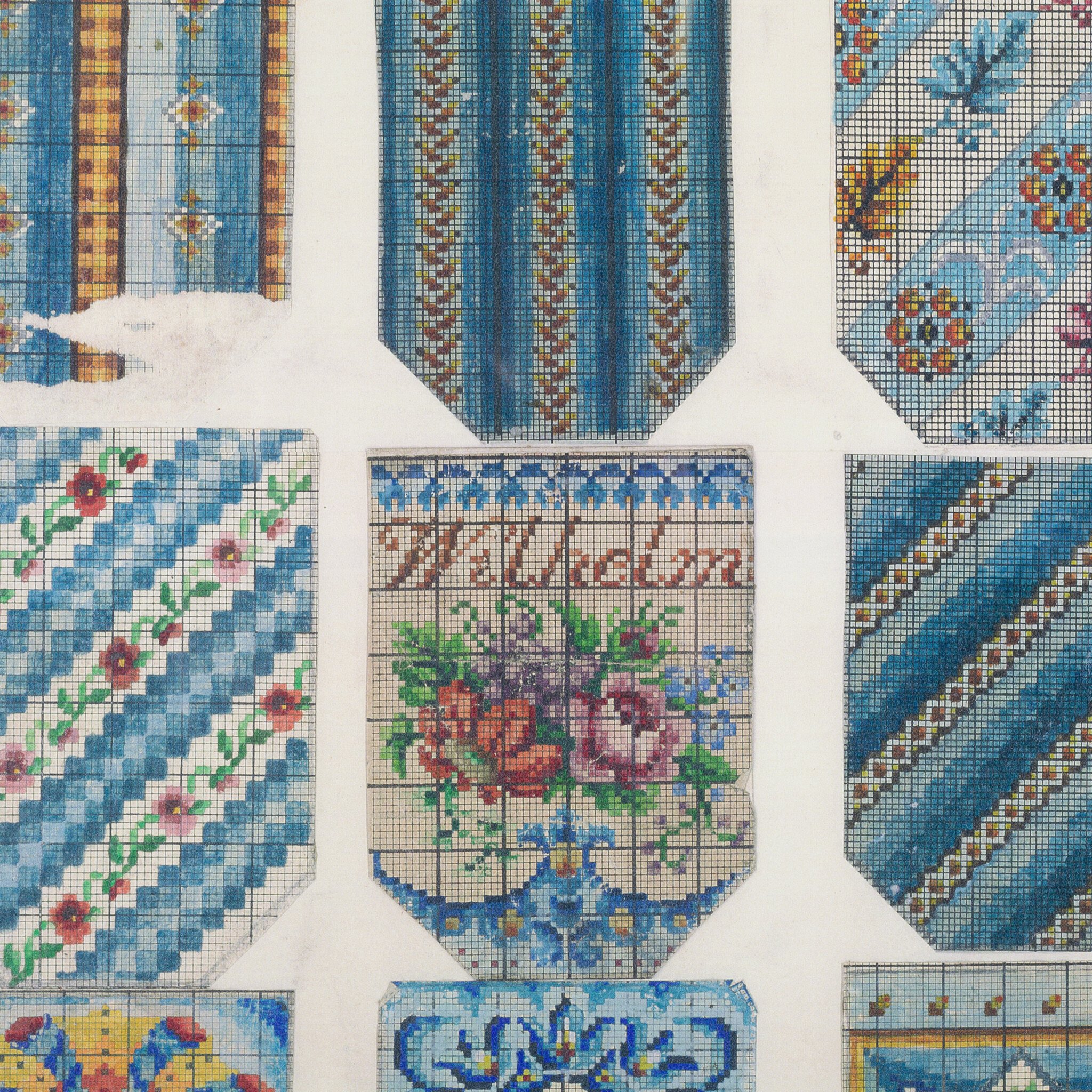 Vel met kopieën van originele patronen voor kralentassen uit de 19de eeuw, in zwart metalen lijst. Afgebeeld zijn diverse kleurrijke patronen met bloemen en geometrische motieven. Op een patroon staat "Wilhelm". In de 19e en begin 20e eeuw waren kralentassen en -buidels erg in de mode. Hoewel het bepaald niet gemakkelijk was, werd met name het breien van tassen populair. De patronen werden gebruikt om de duizenden kralen in juiste volgorde op het garen te rijgen, voordat vervolgens de tas gebreid kon worden. Door de bewerkelijke en tijdrovende techniek behoorden deze kralentassen tot de luxueuze producten. In Nederland vonden de gebreide kralentassen uit Duitsland zoveel aftrek in de klederdrachten dat de Nederlandse vrouw de kralentassen ook zelf ging breien om aan de zilveren beugel te zetten. Conditie: het vel bestaat uit twee delen en is aan de achterzijde met plakband aan elkaar bevestigd, een patroon is beschadigd, vlekken op het vel; gebruikssporen lijst. Afmetingen lijst: 65,5 x 50,5 cm. Afmetingen vel: 47,5 x 31,5 cm.