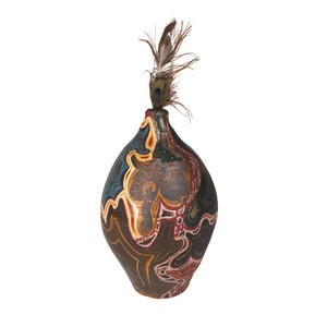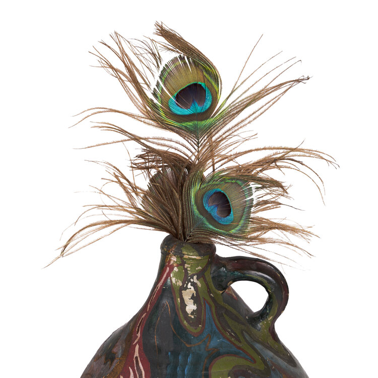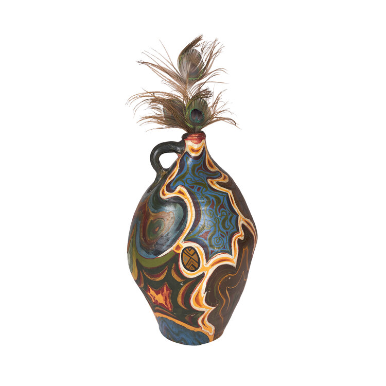 Gres kruik met oor en pauwenveren. De kruik is beschilderd met organische vormen in verschillende kleuren, waaronder bruin, blauw, groen en rood. Datering onbekend. Conditie: vertoont sporen van gebruik, de verf heeft beschadigingen en is op verschillende plekken afgesleten. Afmetingen: ca. 45 x Ø25 cm.
