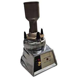 Blender uit het laboratorium met gedeeltelijk ronde sokkel van verchroomd metaal met daarin een electromotor. Op de voorzijde van de sokkel bevindt zich een zwart dashboard met 3 schakelaars voor de standen: 'hi/lo/off'. Ernaast staat: 'Waring Commercial Blendor' met daartussen het fabriekslogo. Uit de bovenzijde van de sokkel steken 4 pootjes, bekleed met zwart rubber. Tussen de pootjes zit het aansluitpunt voor het mengmechanisme in de hoge glazen bak. Deze bak ontbreekt echter. De sokkel is voorzien van een zwart snoer met een stekker van wit porselein. Datering: 1970-1980 Conditie: incompleet want opzetbak ontbreekt, werking niet getest. Afmetingen: ca. 19,8 x 18,1 x 20,0 cm.