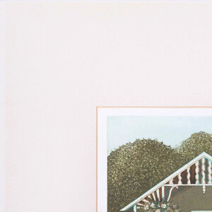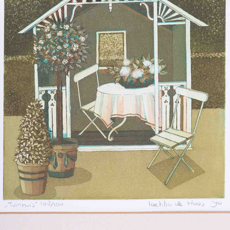 Laetitia de Haas, 'Tuinhuis', 1990. Kleurenets met passe-partout in zwart metalen lijst, oplage 108/150. Afbeelding van een tuinhuis met een tafel en twee stoelen in groen en roze. Rechtsonder signatuur. Conditie: passe-partout is verkleurd; gebruikssporen lijst. Afmeting lijst: 65,5 x 50,5 cm.