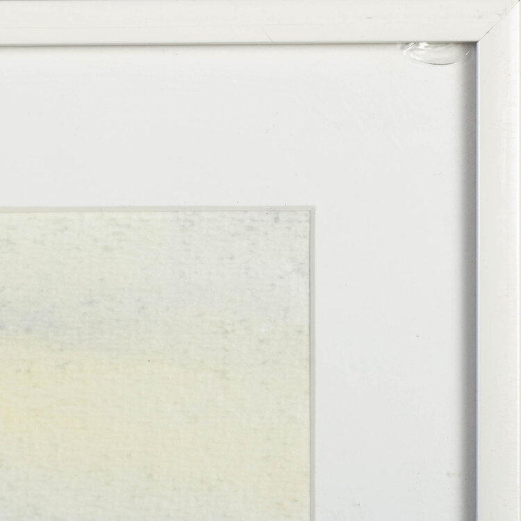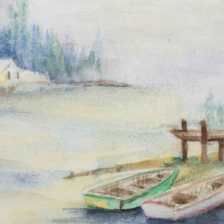 Leni Kuijper- van Rooijen, Zonder titel, 2007. Aquarel op papier in wit metalen lijst. Landschap met op de voorgrond twee bootjes aan het water. Linksonder signatuur. Conditie: werk is in goede conditie, lijst toont gebruikssporen en rechtsboven een chipje in het glas. Afmetingen: werk 23 x 33 cm; lijst 31 x 41 cm.