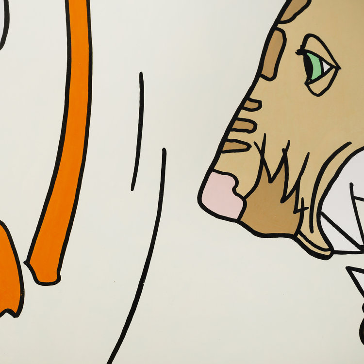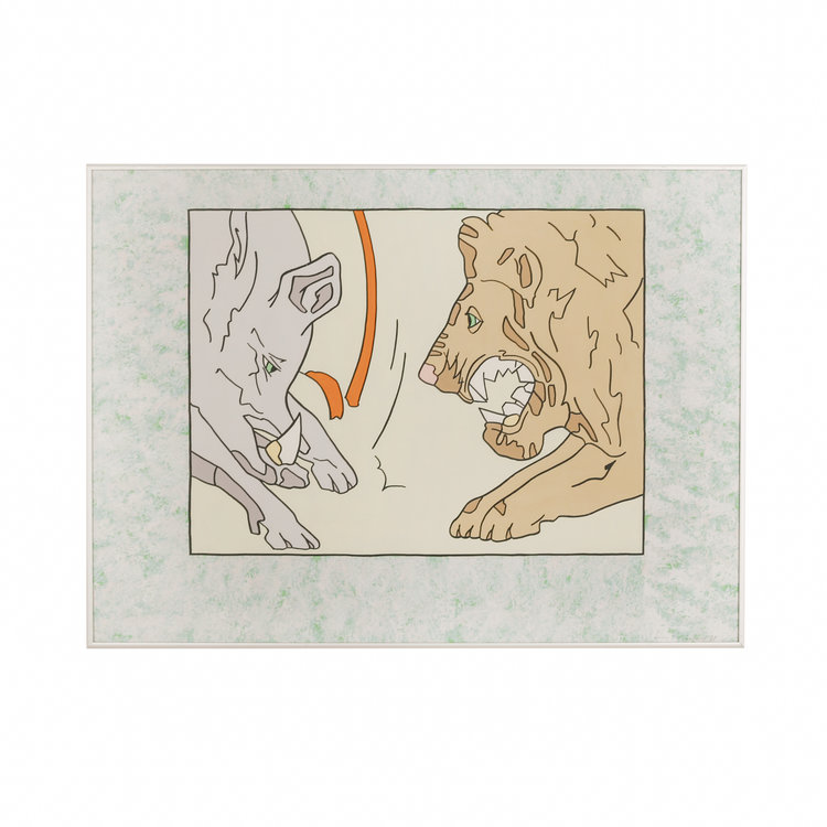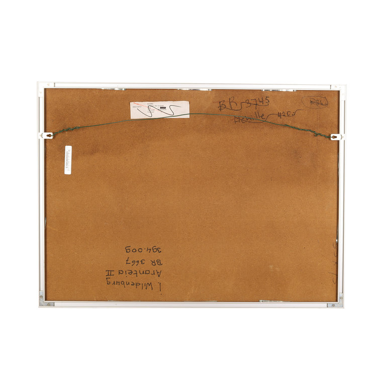 Leon Wildenburg, Aranteia II, jaartal onbekend. Gouache op papier in metalen lijst. Voorstelling van een vechtend everzwijn en leeuw. Om de afbeelding is een zwarte rand geschilderd en daarom heen een wit-groen gevlekte omlijsting. Conditie: goed, gebruikssporen aan lijst. Afmeting werk zonder lijst: 39 x 52 cm.