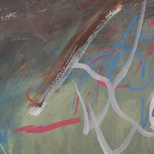 L.G., Zonder titel, 1982. Goache op papier in zwart metalen lijst. Abstracte compositie in groen, blauw, rood, wit en bruin. Rechtsonder signatuur en jaar. Conditie: goed, lijst toont gebruikssporen. Afmetingen: werk: 57 x 41 cm, lijst 76 x 61,5 cm.