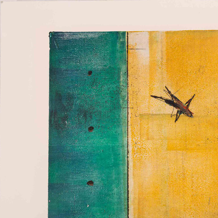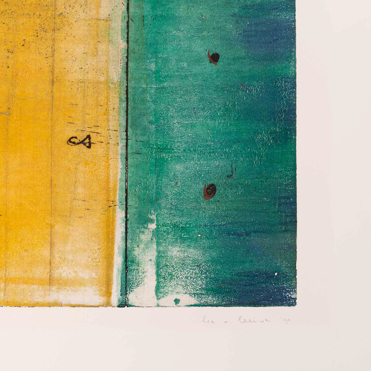 Lie van Leeuwen, 'Zonder titel', 1991. Ets in zwart metalen lijst, oplage 8/40. Voorstelling in geel, blauw en groen met roodbruine details met vissen en sterren. Conditie: Het werk is in goede conditie, gebruikssporen lijst. Afmetingen lijst: ca. 50,5 x 65,5 cm. Afmetingen papier: ca. 47,5 x 61,5 cm.