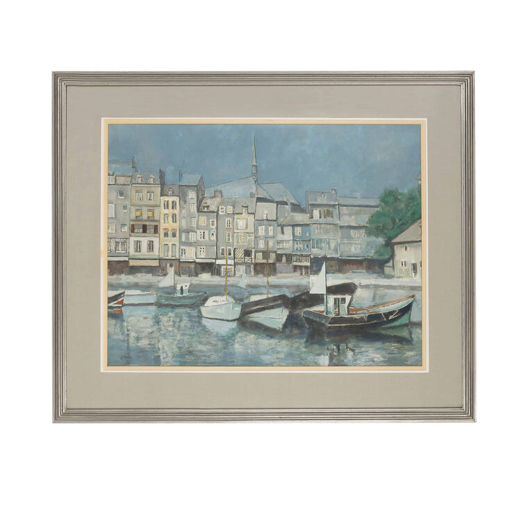 Liebe, Zonder titel, jaartal onbekend. Schilderij op papier in grijs houten lijst. Afbeelding van een haven met zeilboten en daarachter huizen en een kerk. Signatuur linksonder. Conditie: gebruikssporenaan lijst. Afmeting lijst: 72 x 86 cm.