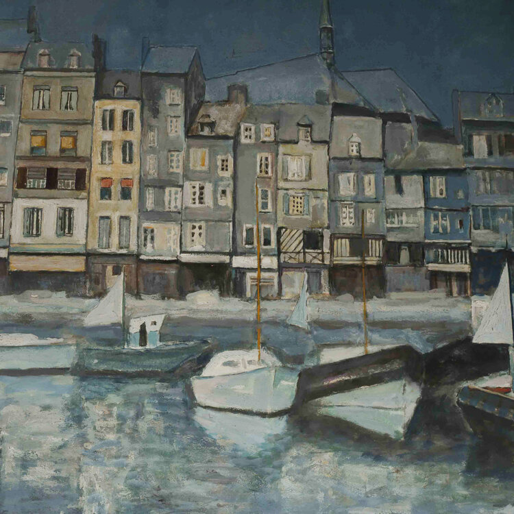 Liebe, Zonder titel, jaartal onbekend. Schilderij op papier in grijs houten lijst. Afbeelding van een haven met zeilboten en daarachter huizen en een kerk. Signatuur linksonder.