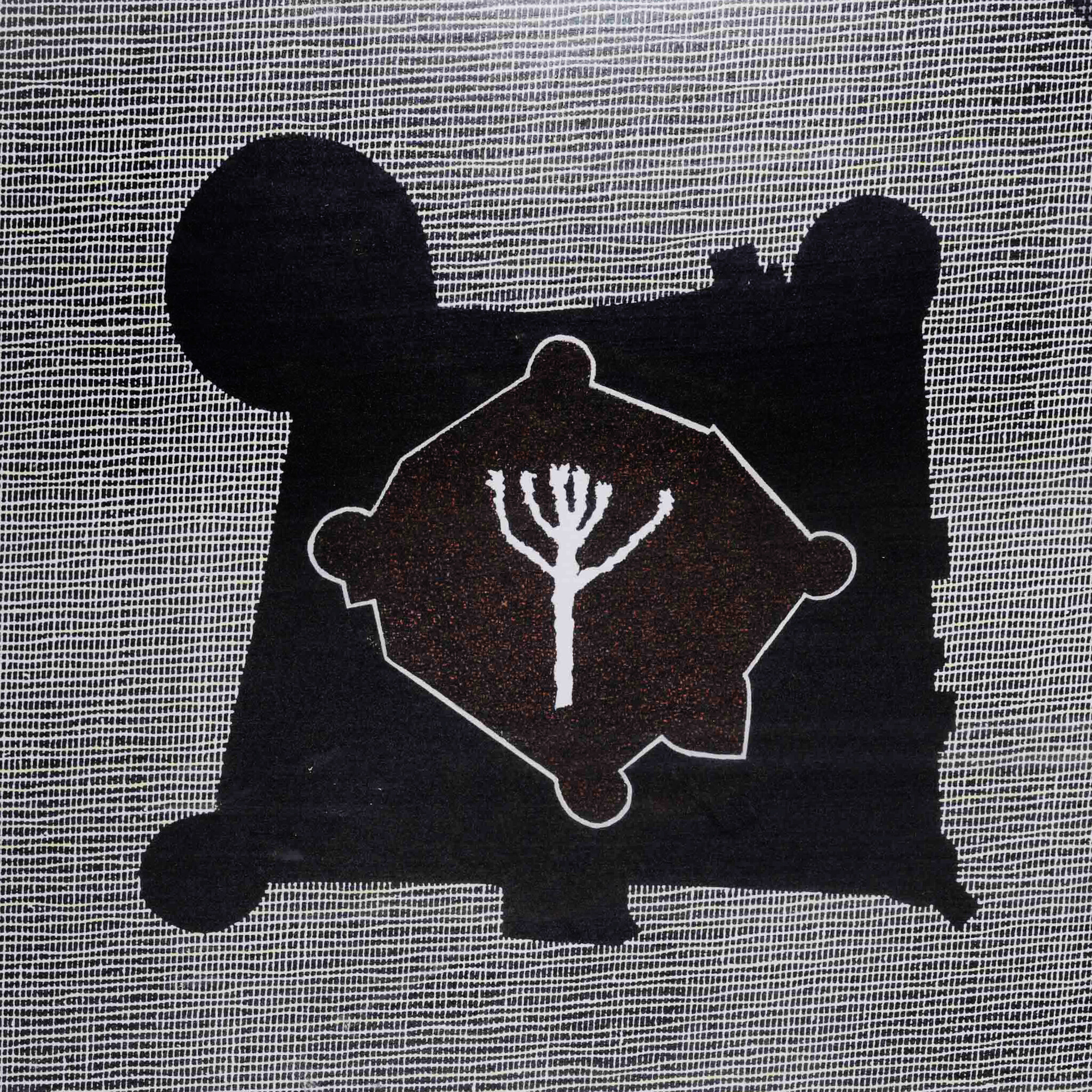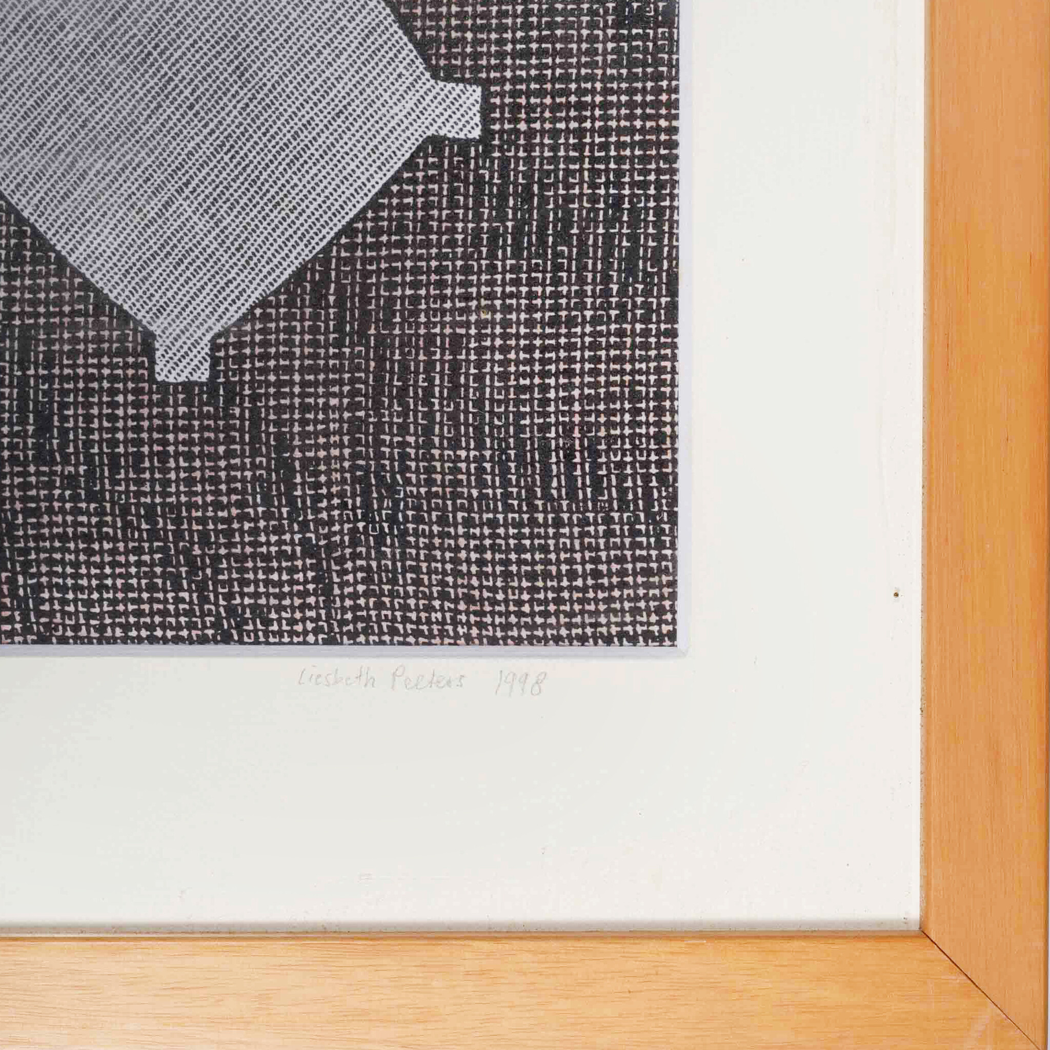 Liesbeth Peeters, 'Zonder Titel', 1998. Gemengde techniek op papier met passe-partout in houten lijst met kunststof plaat. Abstracte voorstelling van twee cirkels, met in de grote cirkel een boomstam met takken in zwart, grijs, wit en abrikoos. Signatuur rechtsonder. Conditie: kunststof plaat is vies, lijst vertoont gebruikssporen. Afmetingen incl lijst: ca 68 x 53 cm.