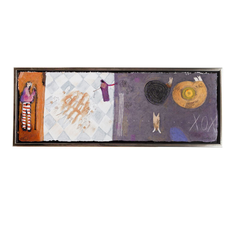Liesbeth Rahder, Compositie II, 2003. Zeefdruk op papier op houten plaat in zilverkleurige baklijst, oplage van 150. Abstracte langwerpige compositie van drie vlakken met figuren in paars, bruint en blauw-tinten. Linksonder oplagenummer, rechtsonder signatuur en jaar. Kunstenares Liesbeth Rahder (geb. 1955) genoot haar opleiding aan de Rietveldacademie te Amsterdam. Haar werk is te herkennen aan gestructureerde kleurvlakken in een afwisselen kleurpalet. Rahder schildert zo veel mogelijk vanuit haar onderbewustzijn en laat het op haar doek gebeuren. Ze maakt vooral schilderijen maar is sinds kort ook bezig met sculptuur. Rahder heeft in verschillende galeries in Nederland en Spanje geëxposeerd. Conditie: goed, de lijst toont lichte gebruikssporen. Afmeting lijst: 41 x 106 cm.