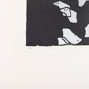 Lily Corver, Zonder titel, 1995. Zeefdruk op papier in metalen lijst, oplage 49/60. Abstracte compositie met witte vormen en zwarte stippen voor een deels groen en deels grijze achtergrond. Linksonder oplagenummer, rechtsonder signatuur en jaar. Conditie: goed, gebruikssporen aan lijst. Afmeting werk zonder lijst: 31 x 29 cm; incl. lijst: 64 x 49 cm.