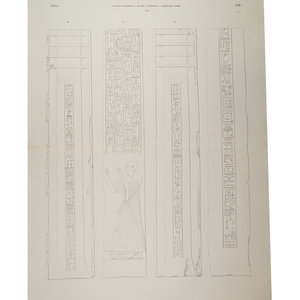 Lithografie gemaakt door Tiemen Hooiberg voor de eerste complete catalogus van de Egyptische collectie van het Rijksmuseum van Oudheden. Getekend zijn de reliëfs op de pijlers uit het graf van Ptahmes. Hij was opperrentmeester in de tempel van Ptah, de stadsgod van Memphis. Datering: 1840. Conditie: de prent is in het middel dubbel gevouwen en toont lichte tekenen van ouderdom. Enkele sporen van waterschade en vlekjes langs de randen. Afmetingen: ca. 54,5 cm x 75,5 cm.