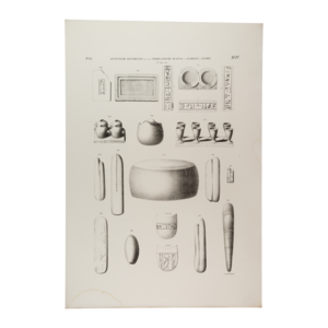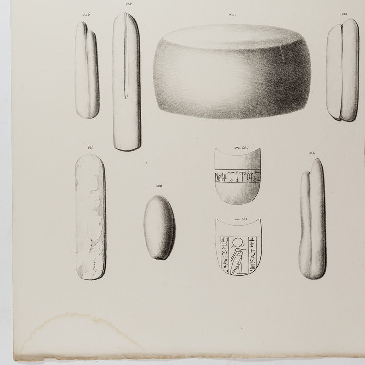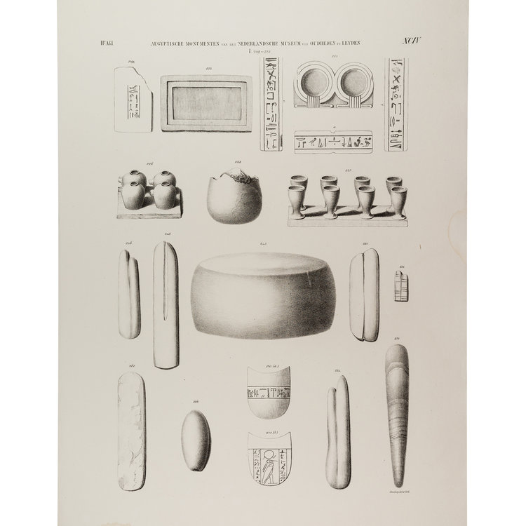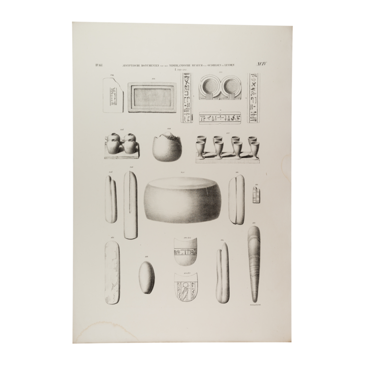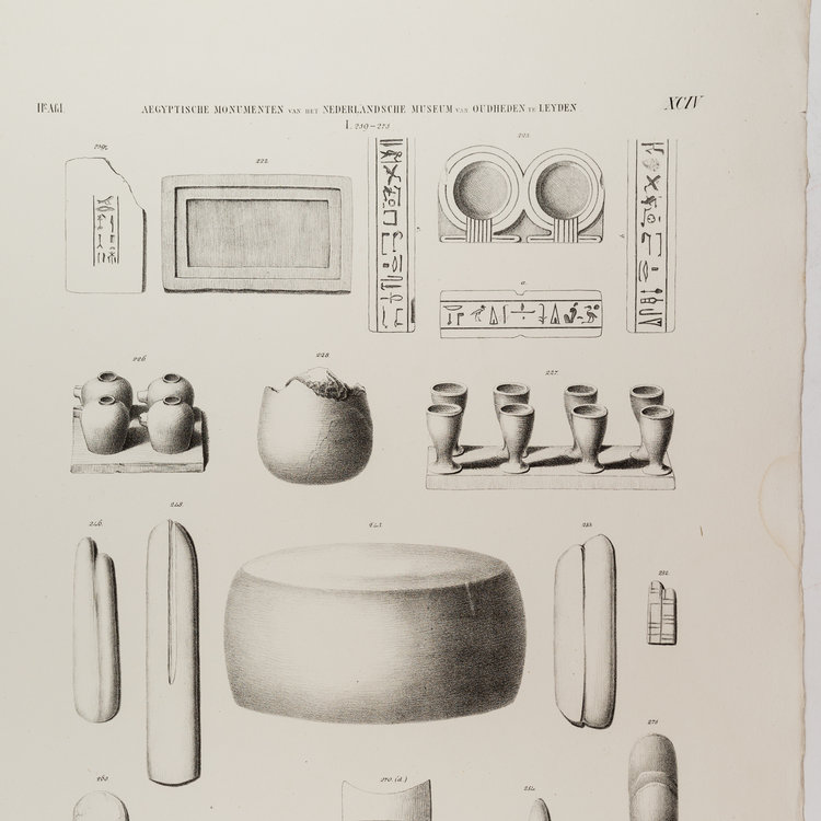 Litho van tekeningen gemaakt door Tiemen Hooiberg voor de eerste complete catalogus van de Egyptische collectie van het Rijksmuseum van Oudheden. Alle objecten zijn te bekijken in de collectiedatabase van de site van het museum. Datering: 1840. Conditie: lichte tekenen van ouderdom en waterschade aan de randen. Afmetingen: ca. 37 x 54 cm.