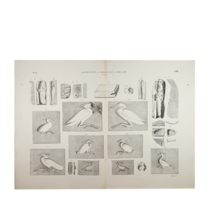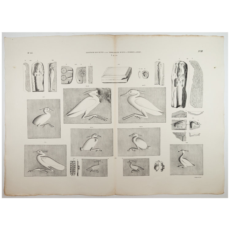 Litho van tekeningen gemaakt door Tiemen Hooiberg voor de eerste complete catalogus van de Egyptische collectie van het Rijksmuseum van Oudheden. Afgebeeld zijn verschillende gietvormen van dieren en mensen, onder andere Osiris en Amset. Alle objecten zijn te bekijken in de collectiedatabase van de site van het museum. Datering: 1840 Conditie: tekenen van ouderdom aan de randen van het vel. In het midden van het vel zit een vouw. Afmetingen: ca. 75 x 54 cm.
