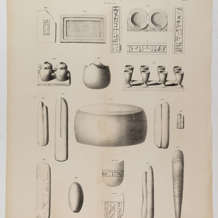 Set van twee lithografieën van tekeningen gemaakt door Tiemen Hooiberg voor de eerste complete catalogus van de Egyptische collectie van het Rijksmuseum van Oudheden. Alle objecten zijn te bekijken in de collectiedatabase van de site van het museum. Datering: 1840. Conditie: lichte tekenen van ouderdom aan de randen. Lichte afdruk van een andere litho zichtbaar. Afmetingen: ca. 37 x 54 cm.