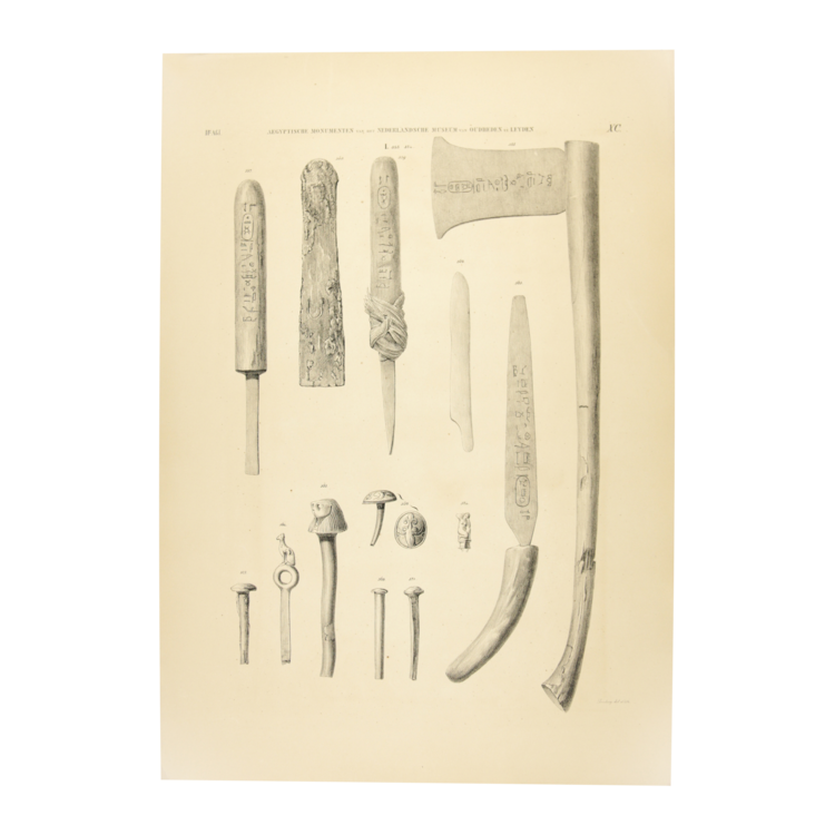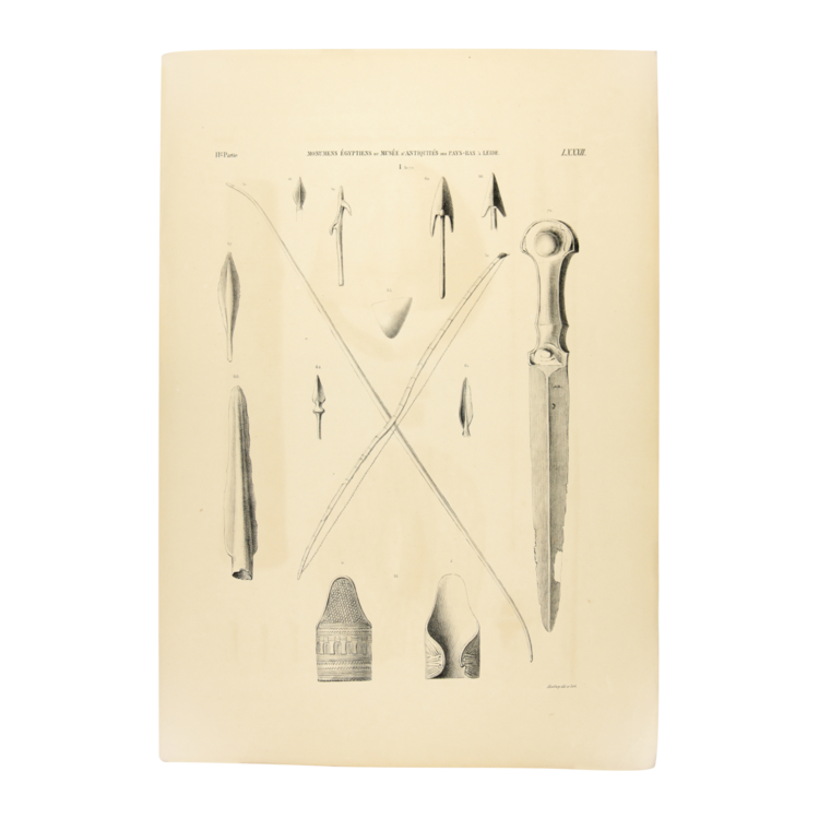 Set van twee lithografieën van tekeningen gemaakt door Tiemen Hooiberg voor de eerste complete catalogus van de Egyptische collectie van het Rijksmuseum van Oudheden. Afgebeeld zijn verschillende wapens en gereedschappen, onder andere een pijl en boog, mes, speerpunten, beitels, een bijl en een soort spijkers. Alle stukken zijn te bekijken in de collectiedatabase van de site van het museum. Datering: 1840. Conditie: lichte tekenen van ouderdom aan de randen en verkleuring van het papier. Afmetingen: ca. 37,5 x 54 cm