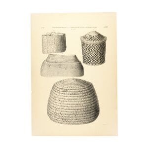 Set van twee litho's gemaakt door Tiemen Hooiberg voor de eerste complete catalogus van de Egyptische collectie van het Rijksmuseum van Oudheden. De litho's hebben afbeeldingen van manden. Alle objecten zijn te bekijken in de collectiedatabase van de site van het museum. Van 1830 tot 1889 werkte Tiemen Hooiberg in het Rijksmuseum van Oudheden te Leiden als opgravingtekenaar, lithograaf en amanuensis. Datering: 1840. Conditie: De prenten vertonen sporen van ouderdom, zoals verkleuring, vlekken en beschadigingen, mn aan de randen. Lichte afdruk van een andere litho zichtbaar. Afmetingen: ca. 54 x 37 cm.