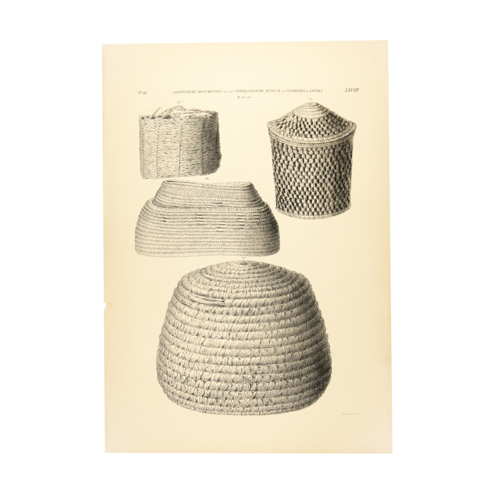 Set van twee litho's gemaakt door Tiemen Hooiberg voor de eerste complete catalogus van de Egyptische collectie van het Rijksmuseum van Oudheden. De litho's hebben afbeeldingen van manden. Datering: 1840.