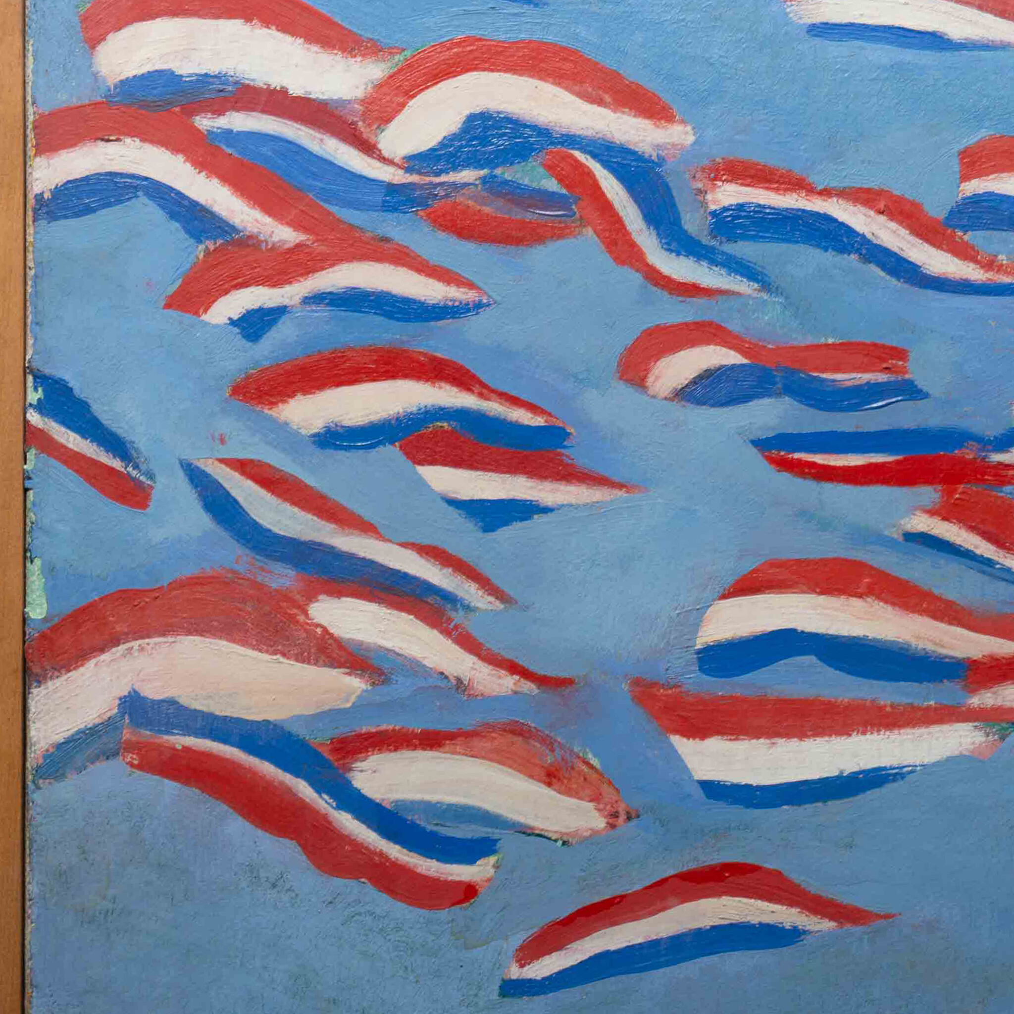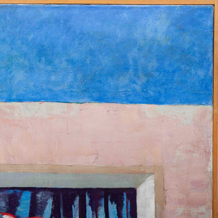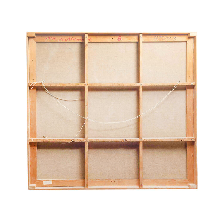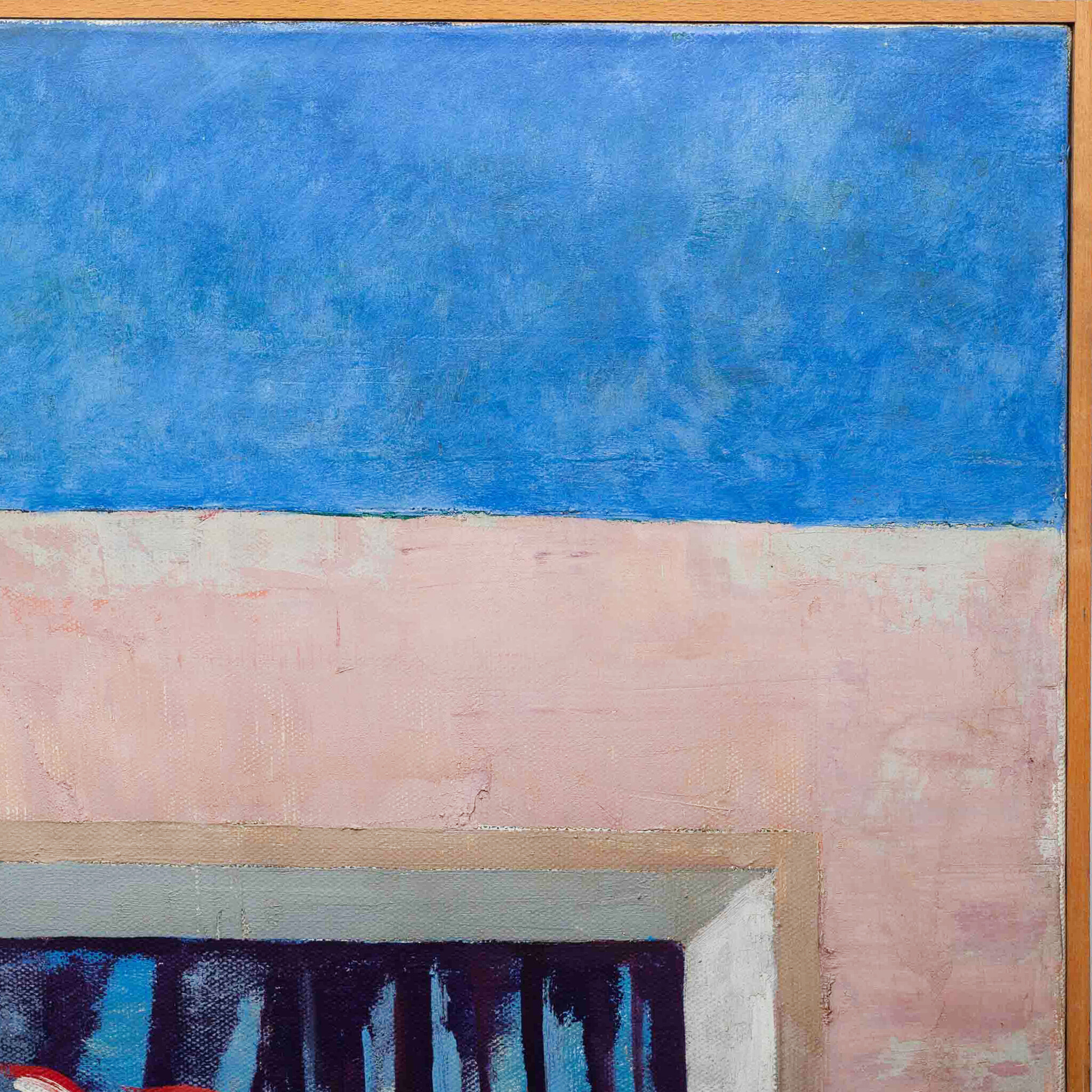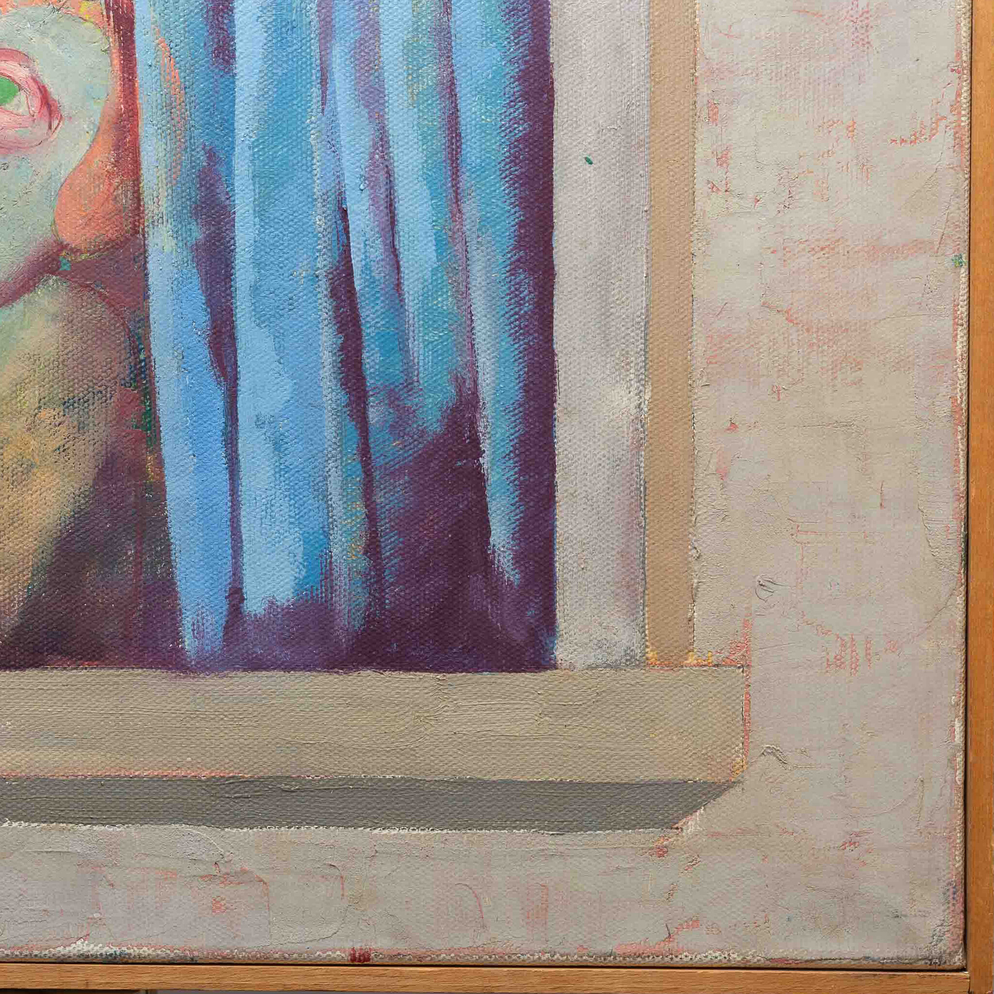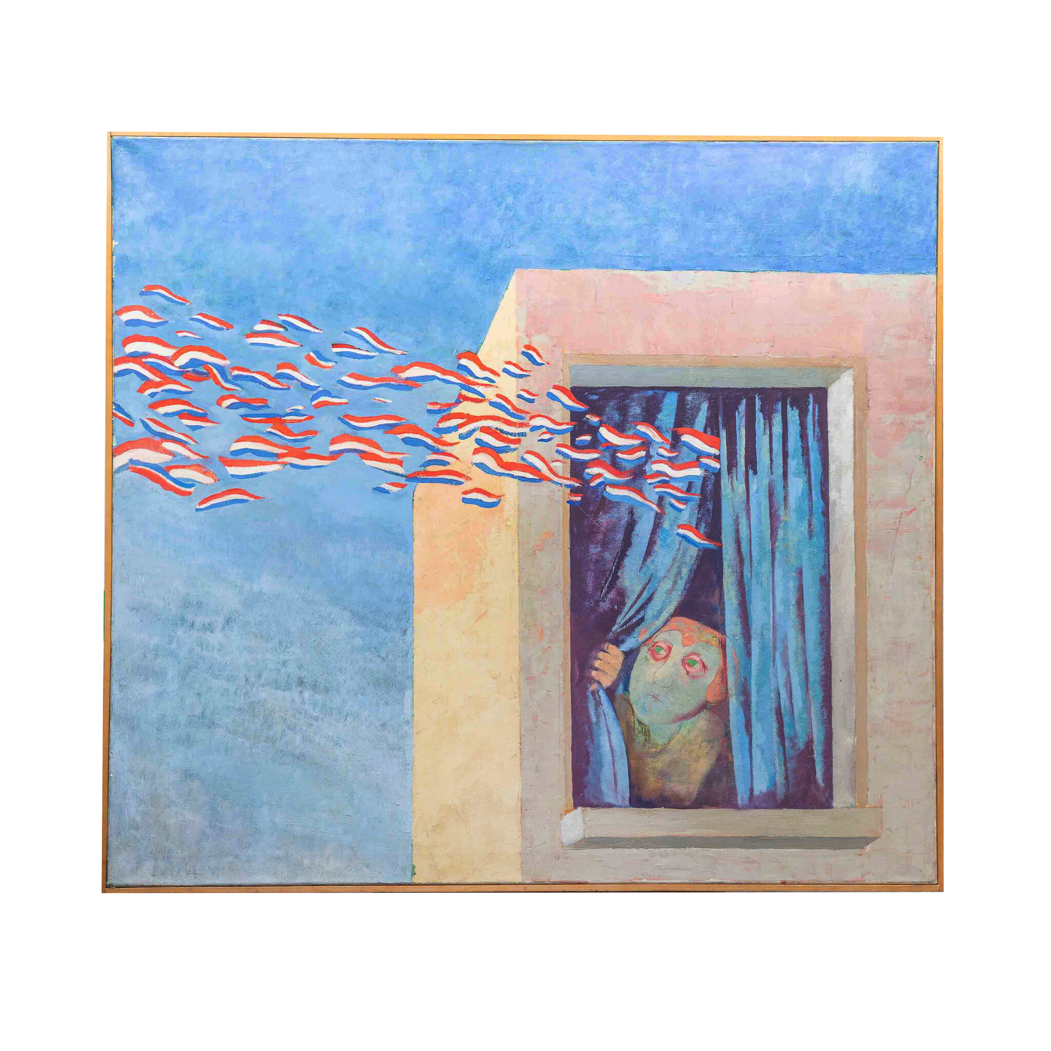 L.M. Willemse, 'Vrouw aan raam', datering onbekend. Olieverf op doek in houten lijst. Afbeelding van een vrouw met masker die uit een raam kijkt waar vlaggetjes uit komen. Het werk is aan de achterzijde gesigneerd. Conditie: aan de randen is de verf wat beschadigd en er zit een kras op het doek. Afmetingen incl. lijst: 112 x 101 cm.