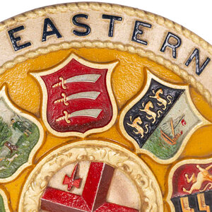 Locomotiefschild van de Great Eastern Railway met daarop acht wapes van Engelse counties. Aan de achterzijde vier bouten waarmee het schild bevestigd was. Datering: halverwege de 20ste eeuw. Conditie: in erg mooie staat. Afmetingen: 39 x 31,5 x 4 cm.