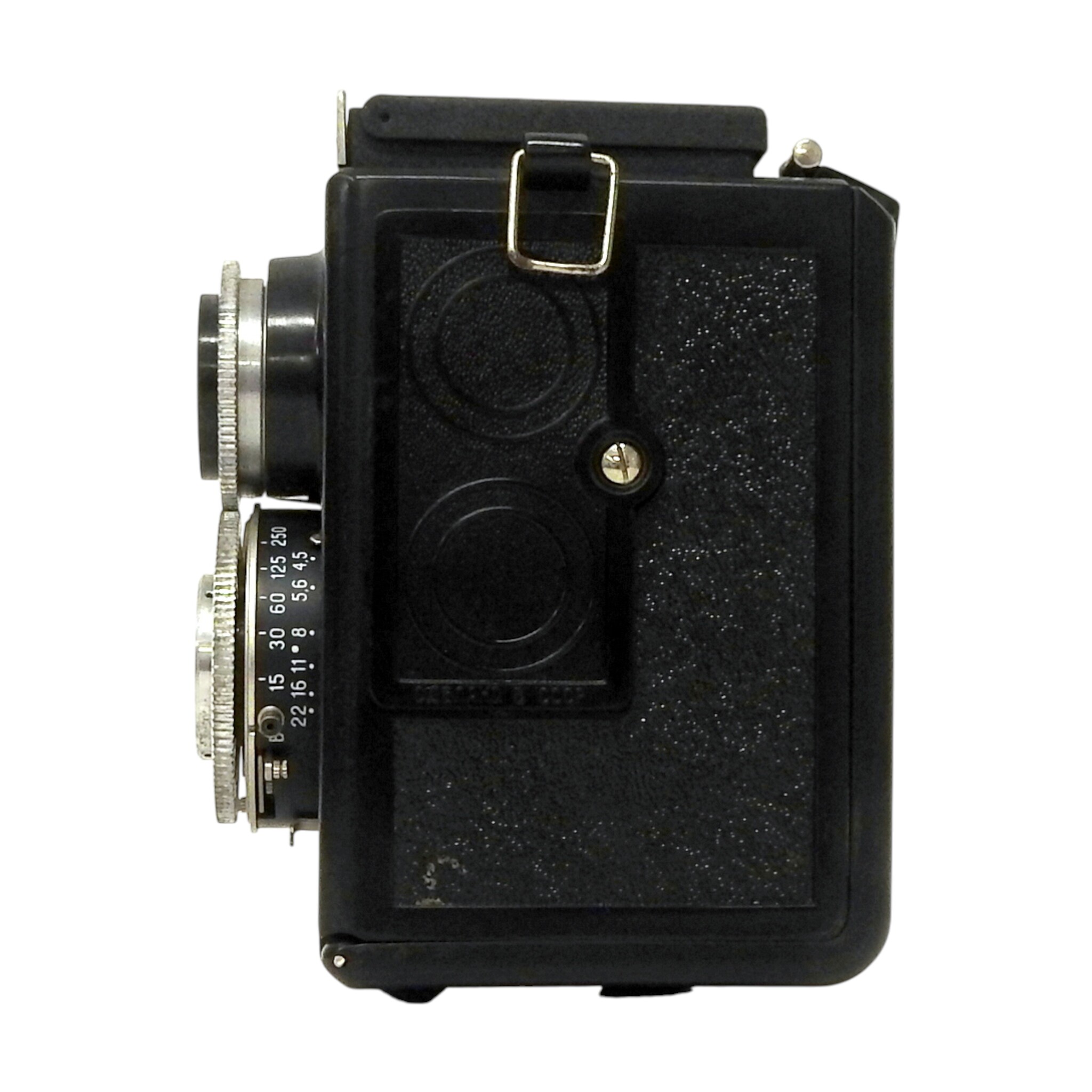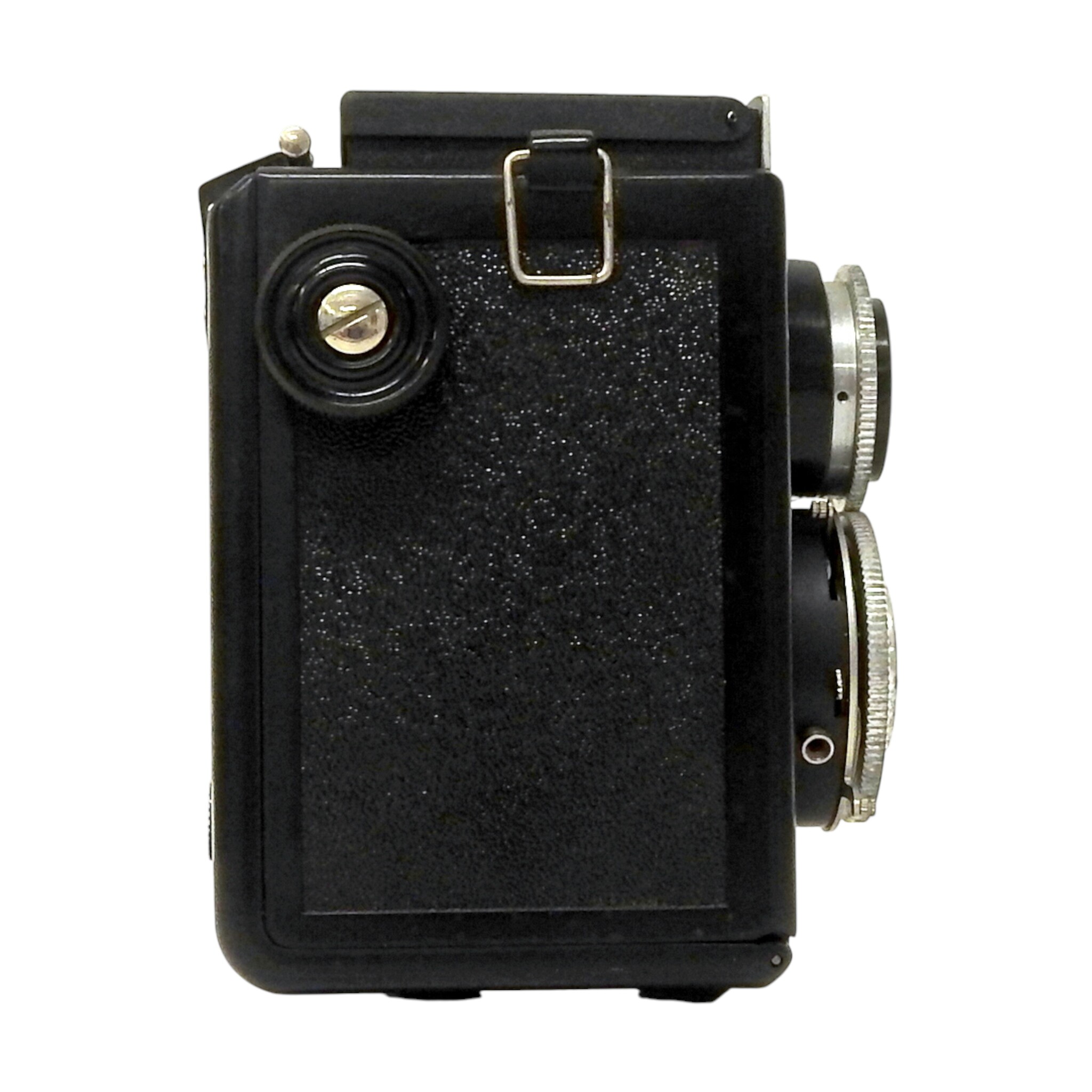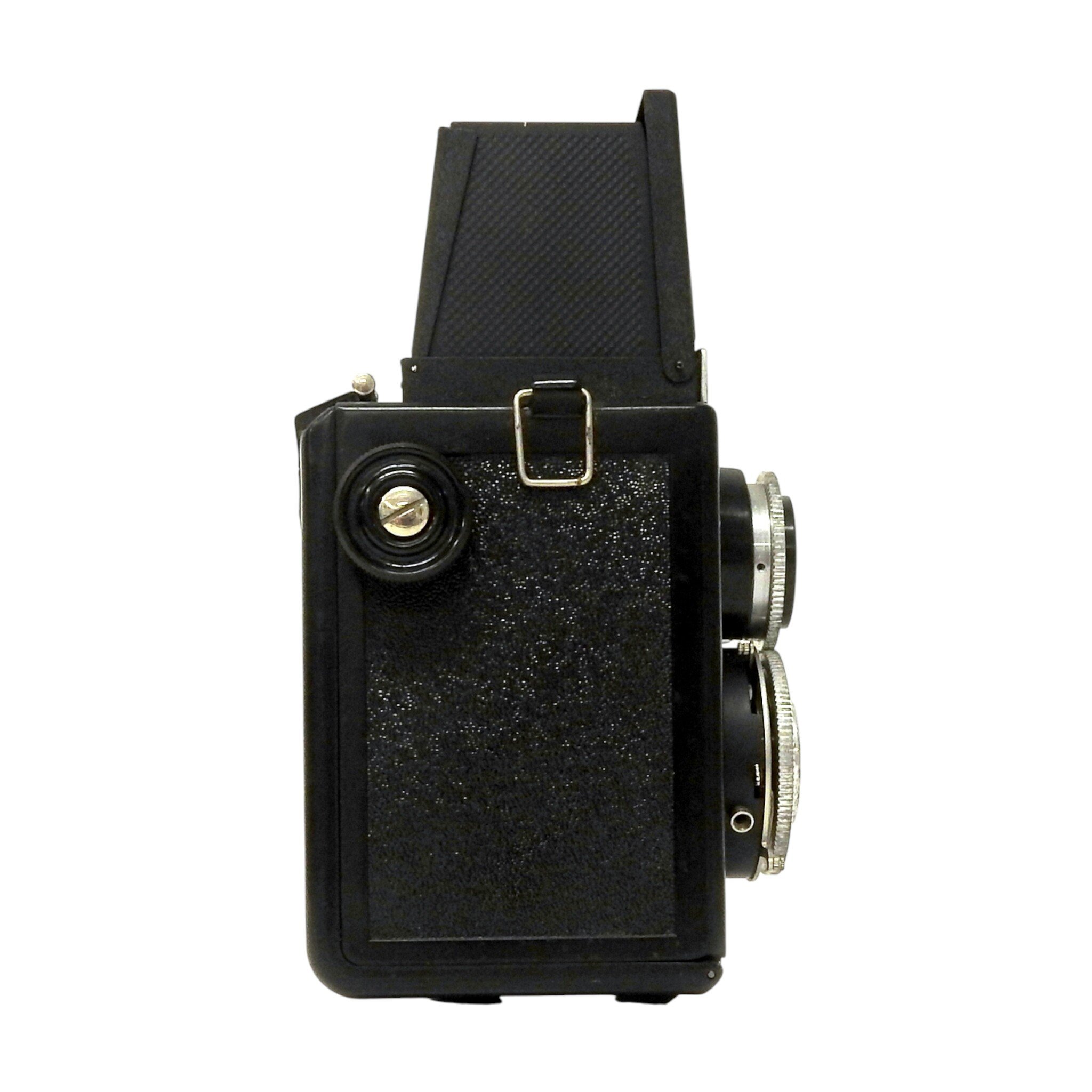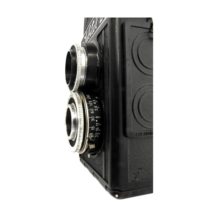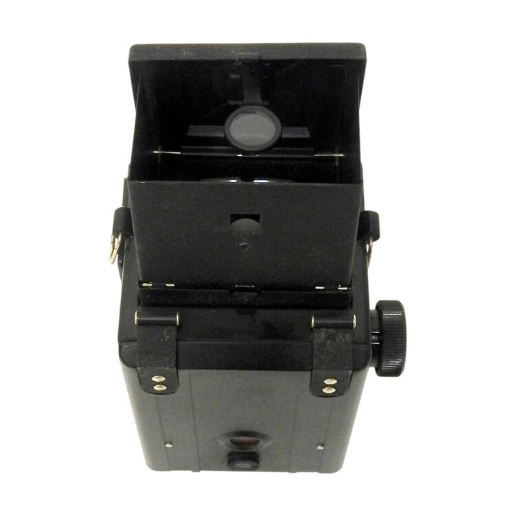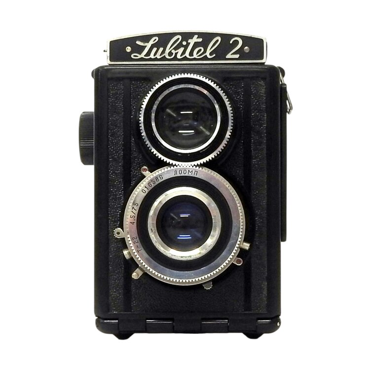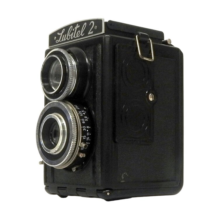 Lubitel 2, 6 x 6 twee-oog spiegelreflexcamera van bakeliet. Bouwjaar 1955-1980. Conditie: goed, werkt nog. Afmetingen: H. 13/17 cm, Br. 9 cm, D. 10 cm.