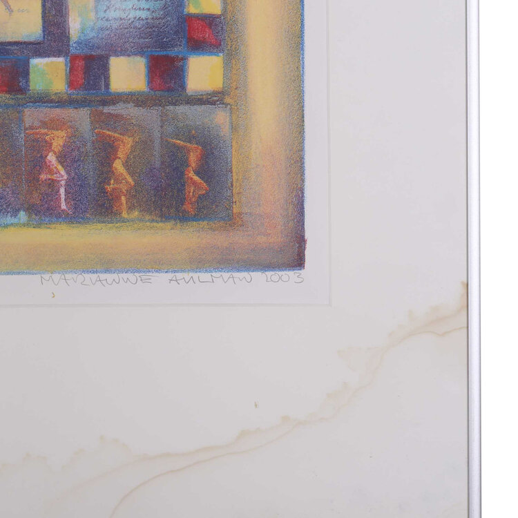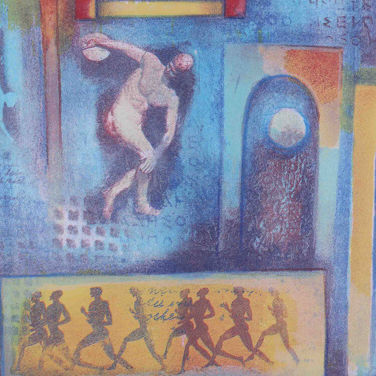 M. Aulman, Olympia I, 2003. Litho in metalen lijst, oplage 10/25. Kleurrijke compositie met diverse sporten van de Olympische spelen uit de Griekse Oudheid afgebeeld. Linksonder oplagenummer en titel, rechtsonder signatuur en jaar. Conditie: gebruikssporen aan lijst en rechtsonder vlek op passe-partout. Afmeting lijst: 84 x 64 cm.