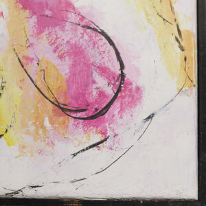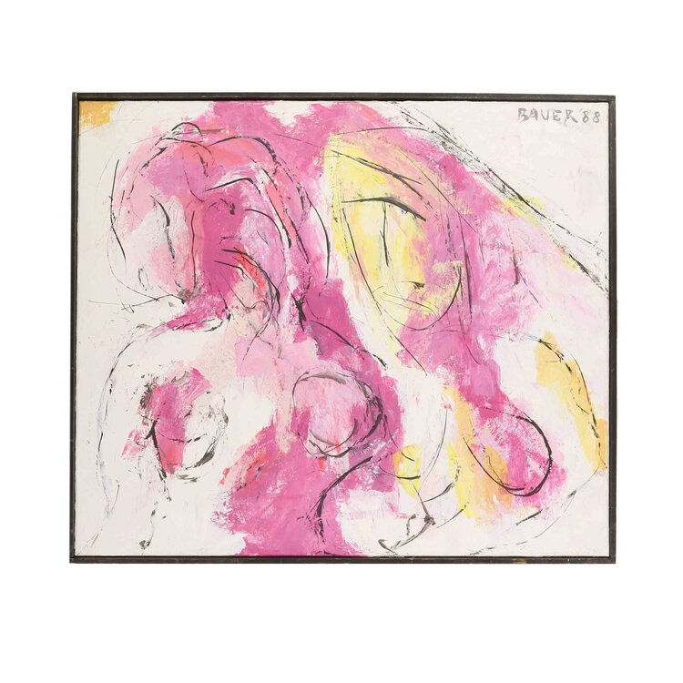 M. Bauer, Je moet kiezen; anders stoten, 1988. Acryl op doek in zwart houten omlijsting. Kleurrijke voorstelling in roze, geel en wit met grove penseelstreken en in zwart details van twee vrouwelijke figuren. Rechtsboven signatuur en jaartal. Conditie: gebruikssporen aan lijst. Afmeting: 72 x 62 cm.