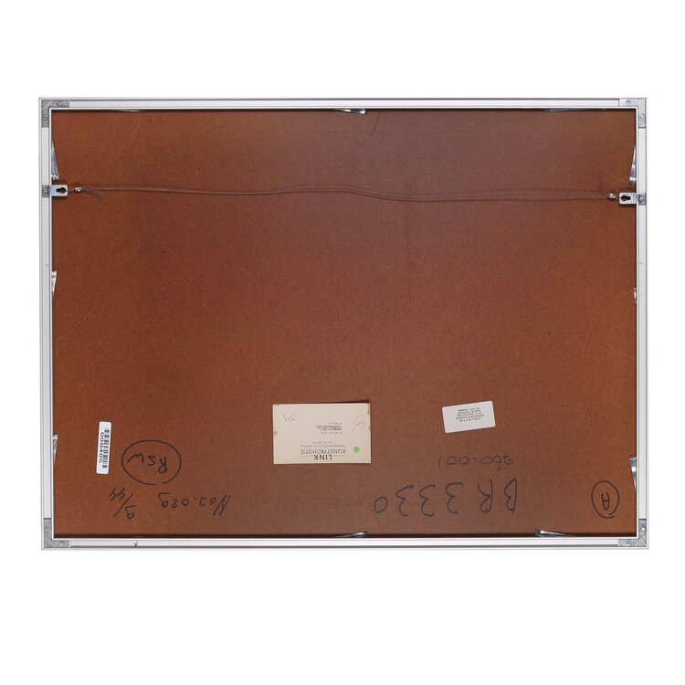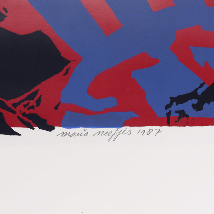 M. Neefjes, First impression, 1987. Zeefdruk op papier in metalen lijst, oplage 9/44. Abstracte compositie in blauw, rood en zwart. Linksonder titel en oplagenummer, rechtsonder signatuur en jaar. Conditie: gebruiksporen aan lijst. Afmeting werk zonder lijst: 48 x 59 cm; incl. lijst: 60,5 x 80 cm.