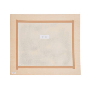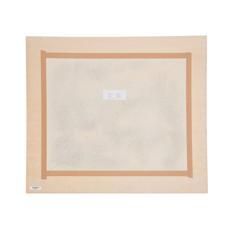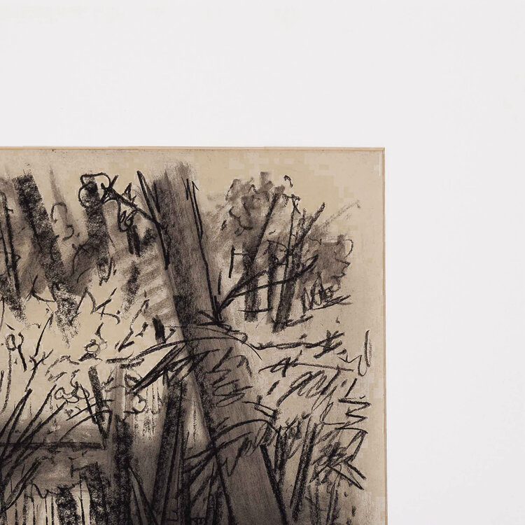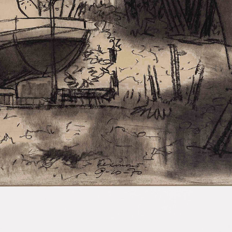 M. v.d. Neut, Lexmond, 1970. Houtskool op papier in passe-partout zonder lijst. Afbeelding van een bootje en een schuur tussen de bomen en struiken, met op de voorgrond een varken in zwart-wit. Signatuur rechtsonder. Conditie: het papier is verkleurd. Afmeting inclusief passe-partout: 68 x 82 cm.