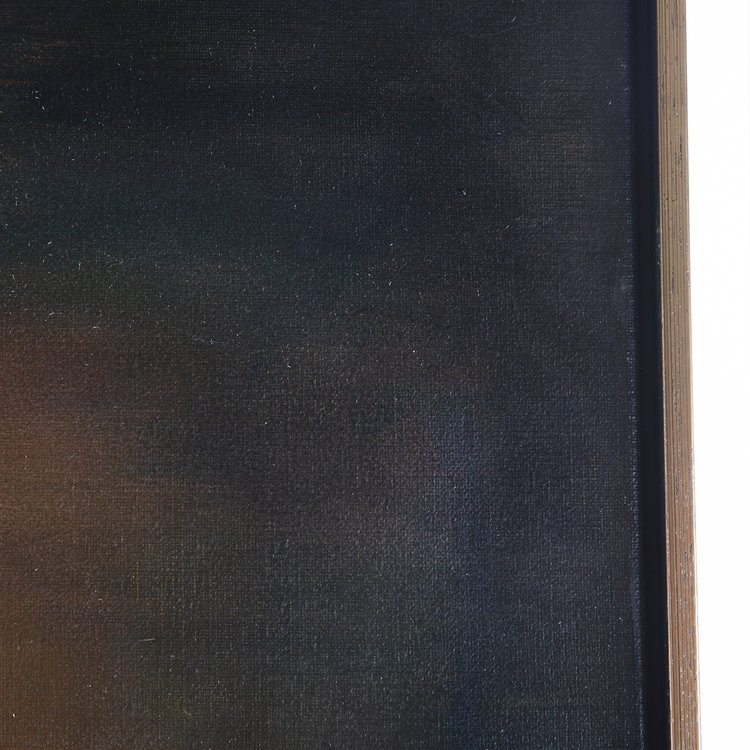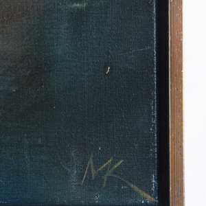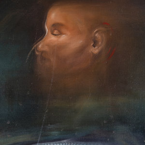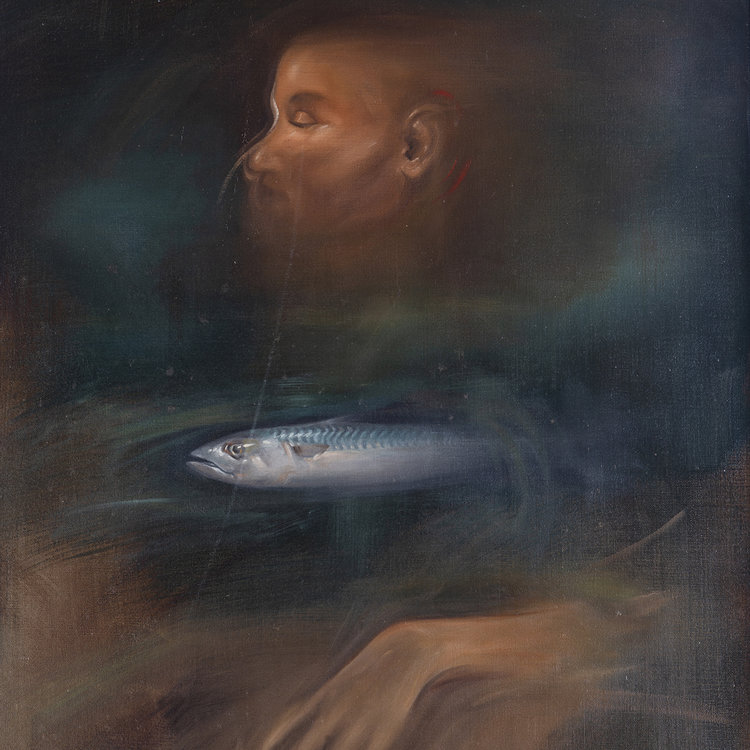 Een donker werk met het hoofd van een man en een vis door Maarten Koopman. Maarten Koopman (1951) is kunstschilder, illustrator en animator. Hij animeerde verschillende films over bekende kunstwerken van kunstenaars als Picasso, van Gogh en Mondriaan. en Datering: 20e eeuw. Conditie: het werk is in redelijke conditie, de lijst is licht beschadigd. Afmetingen: 103 x 74 cm.