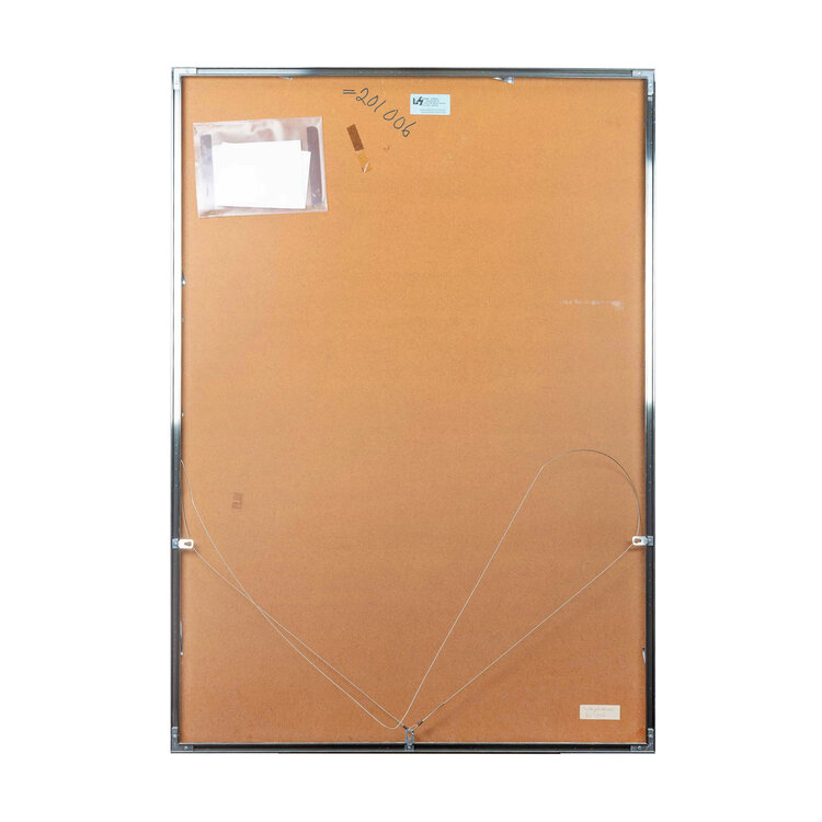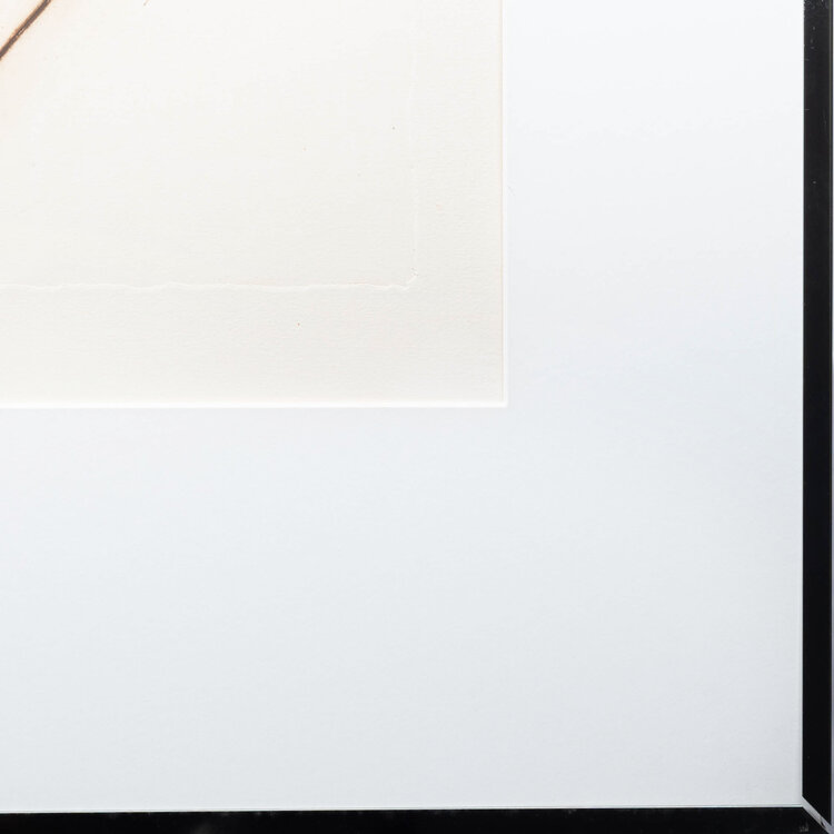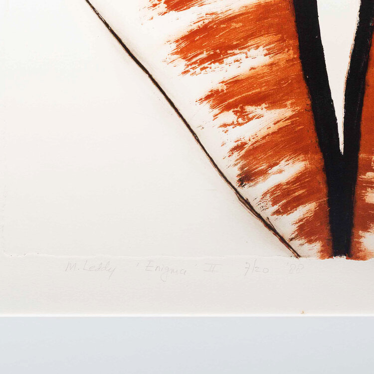 Madeleine Leddy (Amsterdam, 1946), 'Enigma II', 1988. Ets in metalen lijst, oplage 7/20. Abstracte compositie van een uitgerekte ruitvorm met een grote opening in het midden. Signatuur linksonder. Conditie: werk is in goede conditie, lijst toont lichte gebruikssporen en het glas mist. Afmetingen lijst: 112 x 80 cm, beeldvlak: 73 x 49 cm.