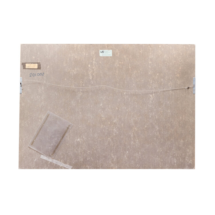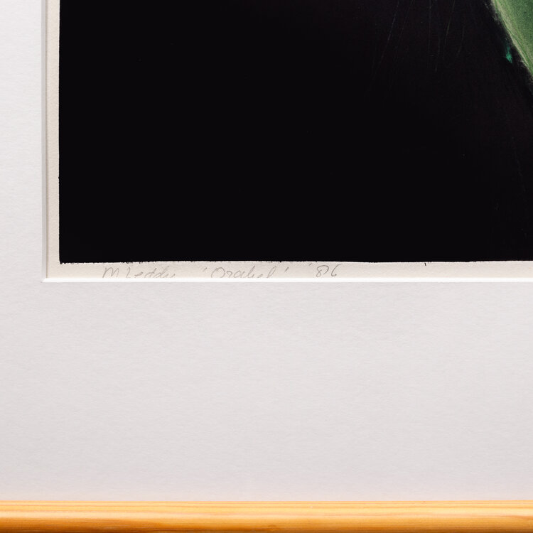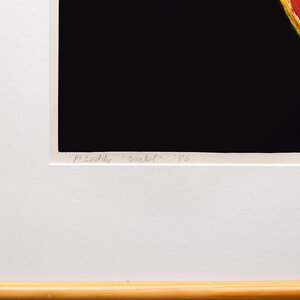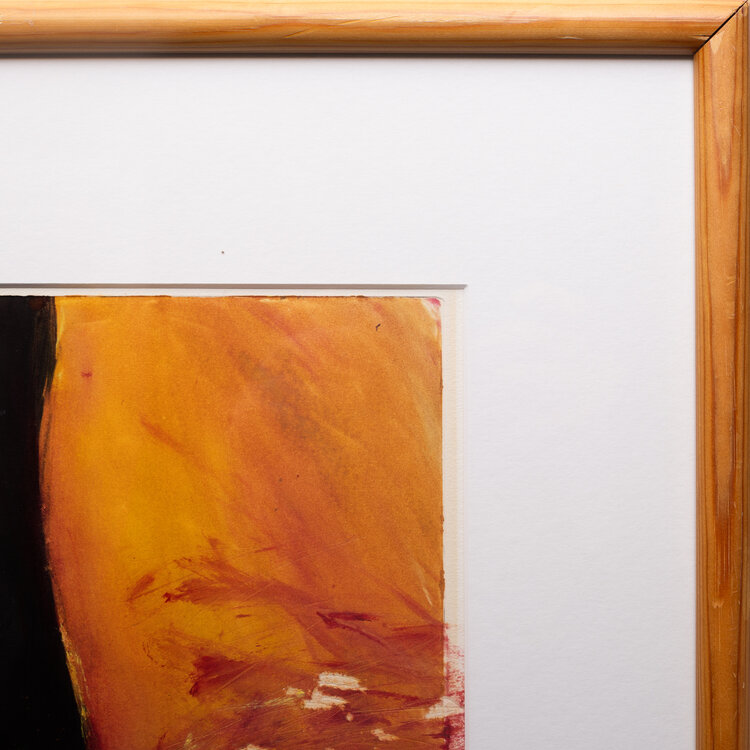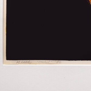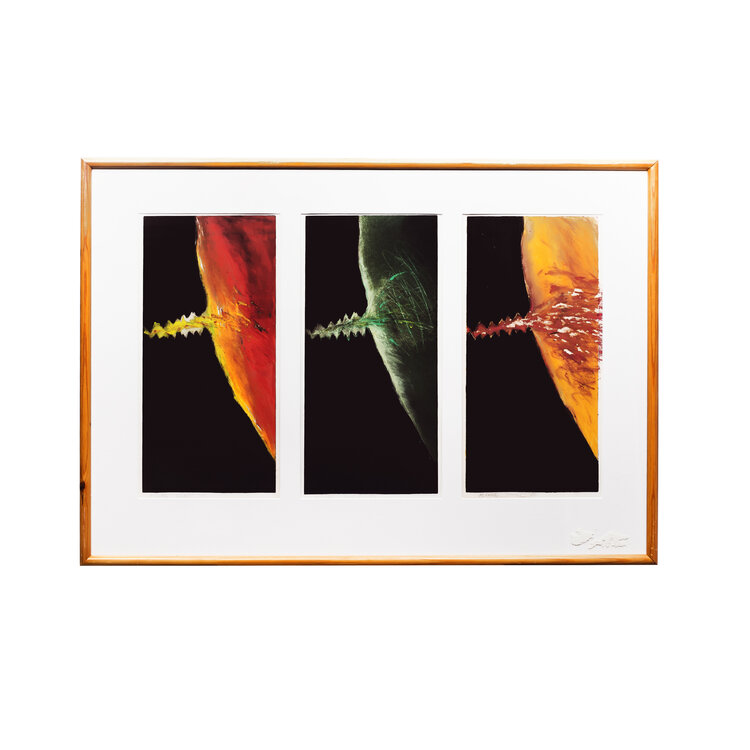 Madeleine Leddy (Amsterdam, 1946), 'Orakel'. Drie etsen samen in een houten lijst met passe-partout. Afdrukken van dezelfde etsplaat met abstracte compositie, in verschillende kleuren. Datering 1986. Conditie: lijst vertoont gebruikssporen, sticker op glas. Afmetingen lijst: 67,5 x 94,5 cm; beeldvlak losse etsen: 45,5 x 21,5 cm.