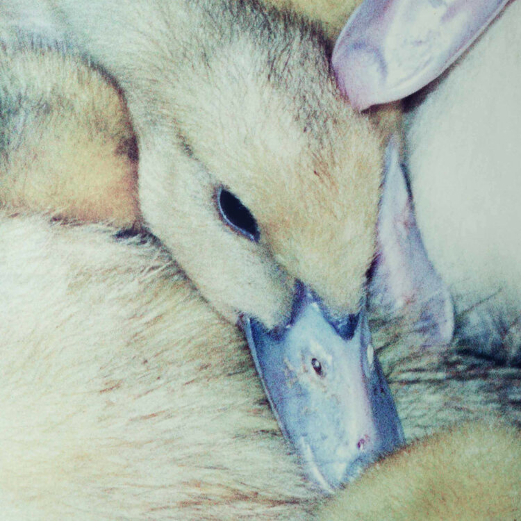 Majorein Gauw, Untitled, 2000. Foto op dibond, oplage 1/3. Close-up van een groep eendenkuikens of pulletjes. Signatuur aan de achterzijde. Conditie: er zitten wat vlekjes op het werk en de hoeken zijn wat beschadigd. Afmetingen: 75,5 x 125,5 cm.