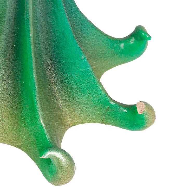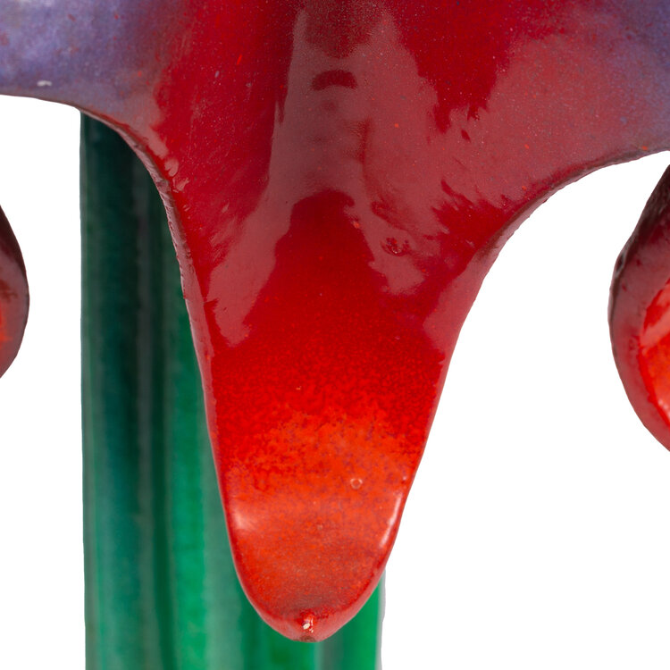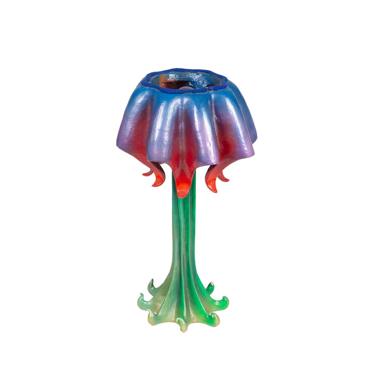 Margreet Hajee (Apeldoorn, 1958), 'Robin good fellow', datering onbekend. Lamp gemaakt van geglazuurd keramiek. Een groene basis met daarop een kap in blauw en rood. Conditie: gebruikssporen, de bovenkant die de lampenkap afsluit ontbreekt, hier en daar zijn de uitstekende delen beschadigd. Afmetingen: ca. 62 x 30 x 30 cm.