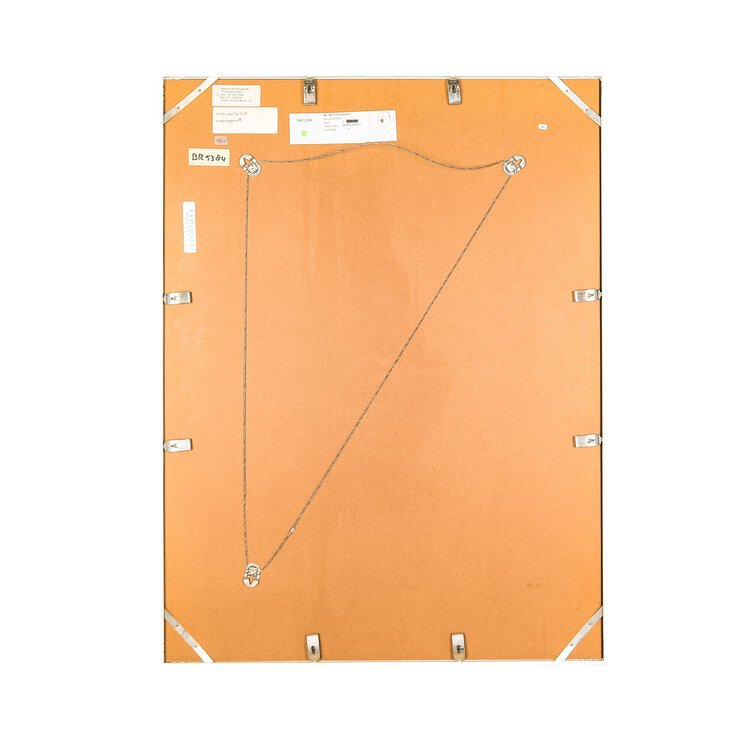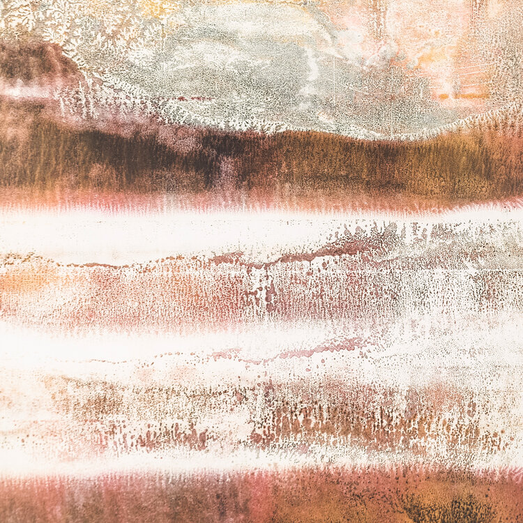 Margriet Westervaarder, Noorderlicht, jaartal onbekend. Monoprint op papier in witte lijst. De print toont een horizontaal gespiegelde afbeelding in roestbruin dat doet denken aan een landschap. Conditie: De monoprint is in goede conditie, al toont de lijst sporen van gebruik. Afmetingen: beeldvlak 81 x 61 cm.