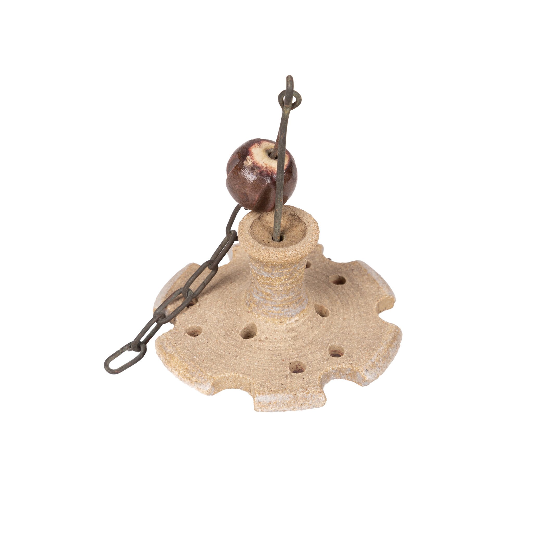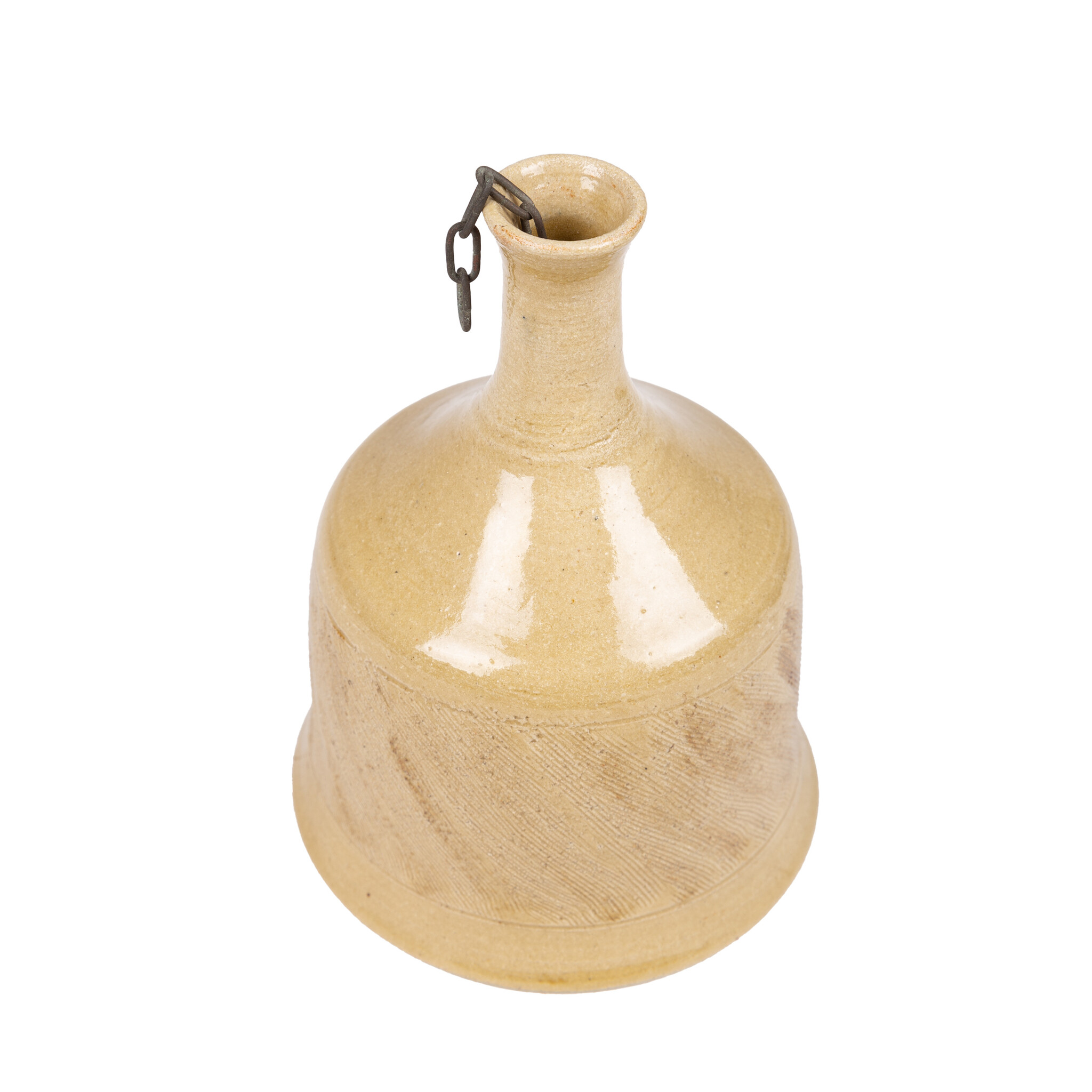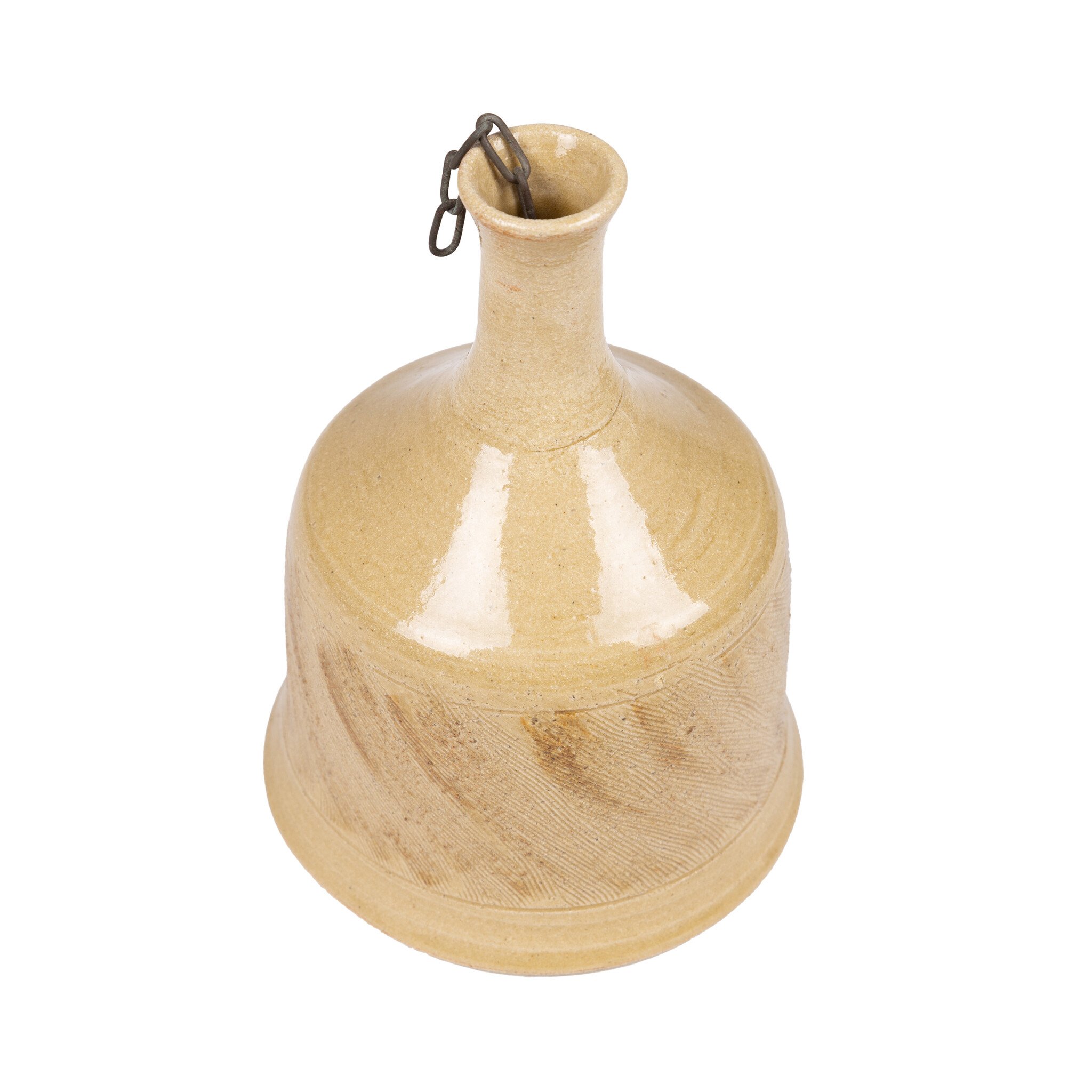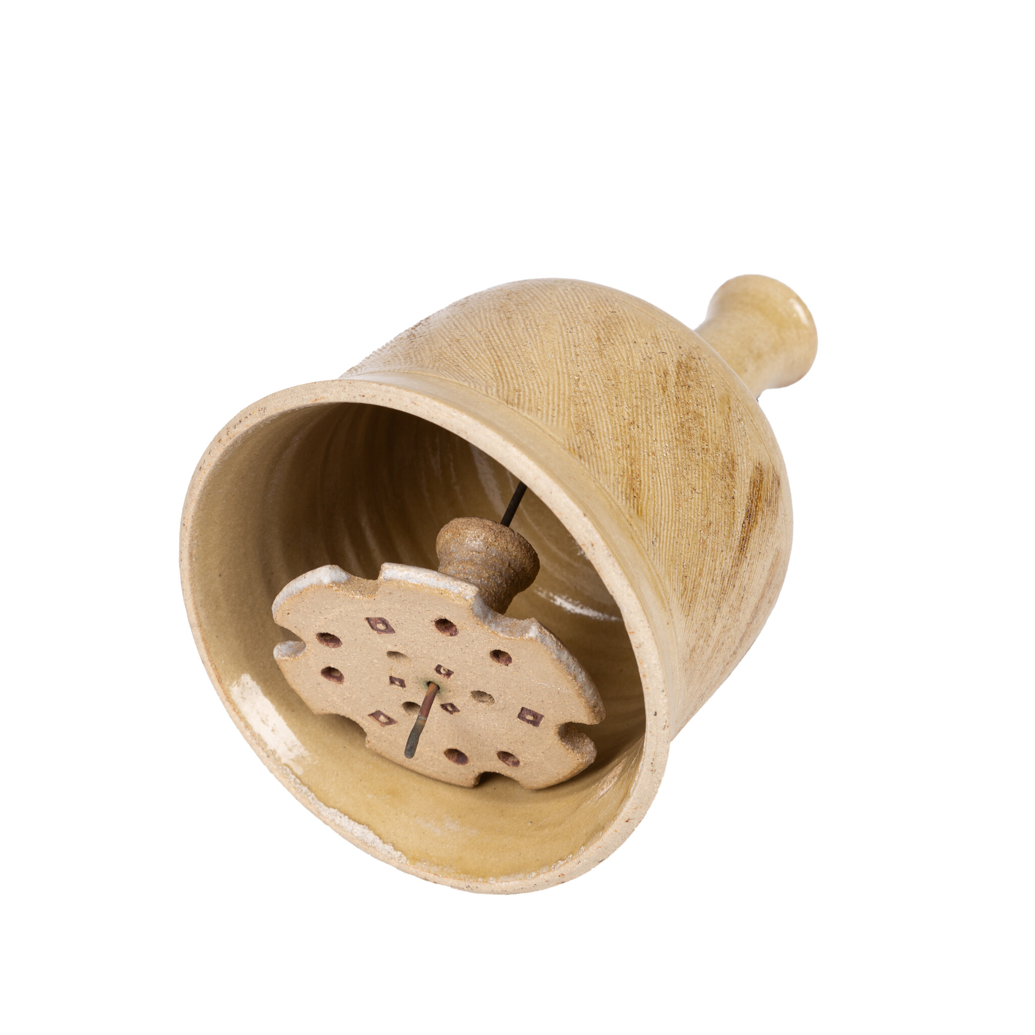 Marianna Franken, Beige keramieken klok/bel met klepel, 1965. De bel is beige geglazuurd en gedecoreerd met reliëfpatronen. De klepel zit er los bij. Marianna Virginia Franken (Amsterdam, 2 februari 1928 - Laren, 15 februari 2025) heeft in 1965 een keramieken miniklokkenspel gemaakt voor in de buitenlucht. Het klokkenspel bevatte dertig klokken, opgehangen aan een stalen constructie. De keramieken klepels sloegen bij wind tegen de klokken aan waarbij er klanken ontstonden. Conditie: roest aan de ketting van de klepel. Afmetingen: ca 18 x Ø 13 cm.