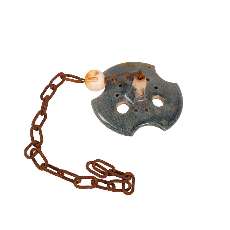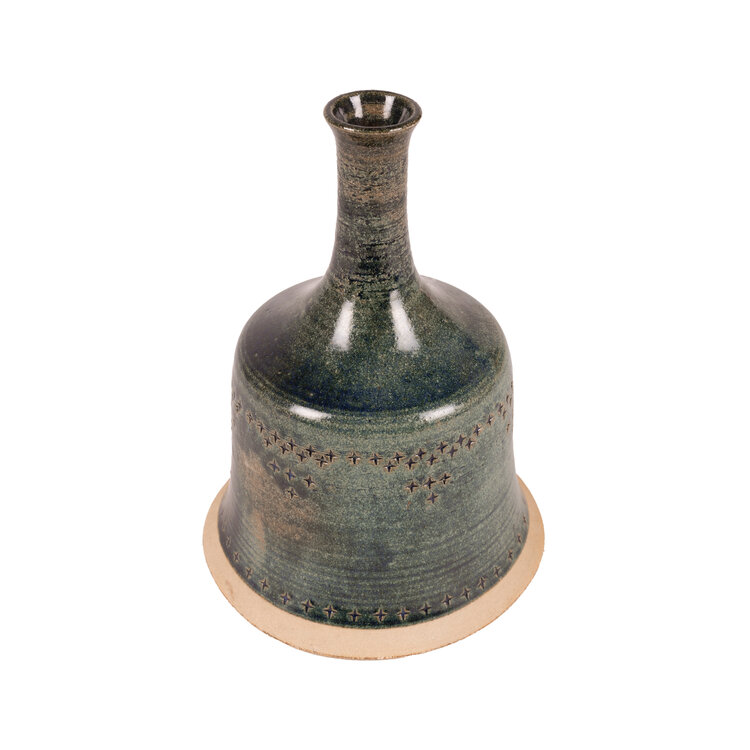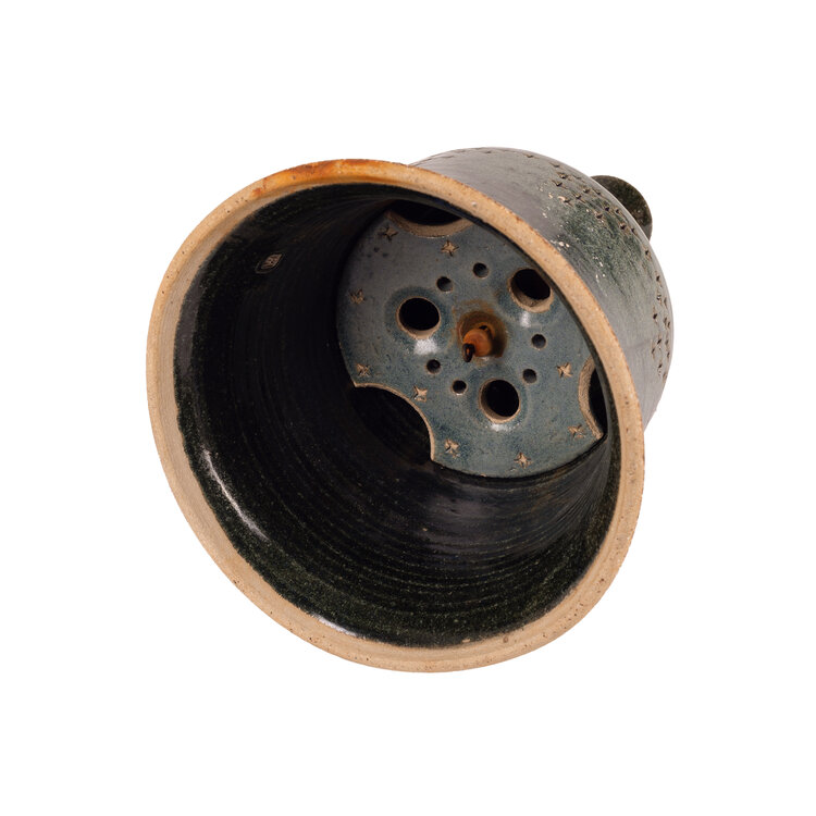 Marianna Franken, Blauwgroene keramieken klok/bel met klepel, 1965. De bel is blauwgroen geglazuurd, met een beige ongeglazuurde onderrand en gedecoreerd met reliëfpatronen. De klepel zit er los bij. Marianna Virginia Franken (Amsterdam, 2 februari 1928 - Laren, 15 februari 2025) heeft in 1965 een keramieken miniklokkenspel gemaakt voor in de buitenlucht. Het klokkenspel bevatte dertig klokken, opgehangen aan een stalen constructie. De keramieken klepels sloegen bij wind tegen de klokken aan waarbij er klanken ontstonden. Conditie: de bel heeft een barst, roest aan de ketting van de klepel. Afmetingen: ca 25 x Ø 17 cm.