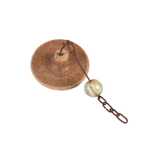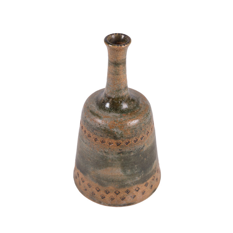 Marianna Franken, Groen-bruine keramieken klok/bel met klepel, 1965. De geglazuurde bel heeft verschillende groen- en bruintinten en is gedecoreerd met reliëfpatronen. De klepel zit er los bij. Marianna Virginia Franken (Amsterdam, 2 februari 1928 - Laren, 15 februari 2025) heeft in 1965 een keramieken miniklokkenspel gemaakt voor in de buitenlucht. Het klokkenspel bevatte dertig klokken, opgehangen aan een stalen constructie. De keramieken klepels sloegen bij wind tegen de klokken aan waarbij er klanken ontstonden. Conditie: roest aan de ketting van de klepel. Afmetingen: ca 20 cm hoog, met een diameter van ca 12 cm.