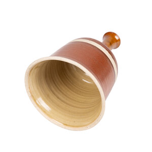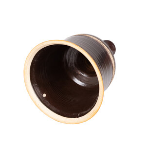 Marianna Franken, Twee keramieken klokken/bellen, 1965. De bellen hebben een handvat. Ze zijn bruin en roodbruin geglazuurd. Tweekleurig en met een geribbelde decoratie. Marianna Virginia Franken (Amsterdam, 2 februari 1928 - Laren, 15 februari 2025) heeft in 1965 een keramieken miniklokkenspel gemaakt voor in de buitenlucht. Het klokkenspel bevatte dertig klokken, opgehangen aan een stalen constructie. De keramieken klepels sloegen bij wind tegen de klokken aan waarbij er klanken ontstonden. Conditie: kleine beschadigingen aan de onderrand, de klepel ontbreekt. Afmetingen: ca 23 x Ø 15 cm; 24 x Ø 16,5 cm.