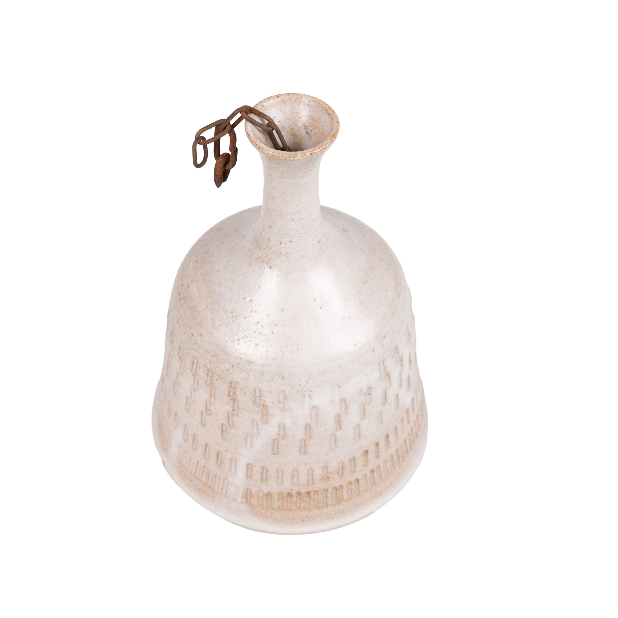 Marianna Franken, Twee lichtgrijze keramieken klokken/bellen met klepel, 1965. De bellen zijn wit geglazuurd, wat een lichtgrijs effect geeft. Ze zijn ook gedecoreerd met reliëfpatronen. Bij de kleine bel hangt aan de binnenkant een keramieken klepel aan een metalen ketting, die aan de bovenkant van het handvat naar buiten komt. Bij de grote bel zit de klepel er los bij. Marianna Virginia Franken (Amsterdam, 2 februari 1928 - Laren, 15 februari 2025) heeft in 1965 een keramieken miniklokkenspel gemaakt voor in de buitenlucht. Het klokkenspel bevatte dertig klokken, opgehangen aan een stalen constructie. De keramieken klepels sloegen bij wind tegen de klokken aan waarbij er klanken ontstonden. Conditie: de grote bel heeft barsten en aan de onderkant is een stuk afgebroken, roest aan de ketting van de klepel. Afmetingen: ca 20 x Ø 13 cm; 26 x Ø 18 cm.