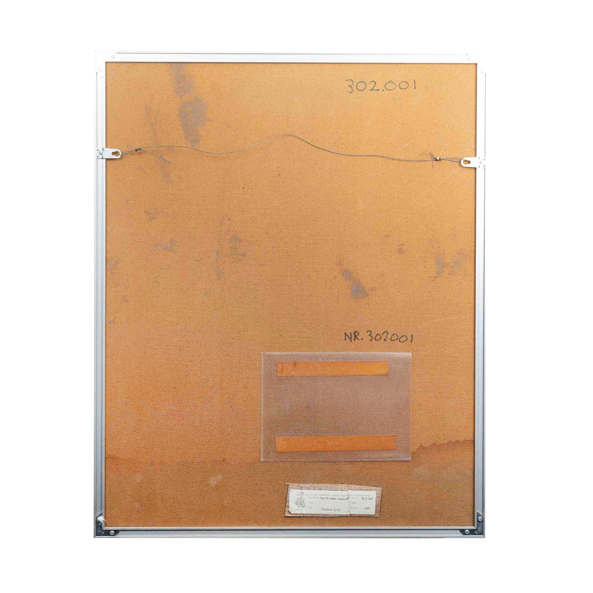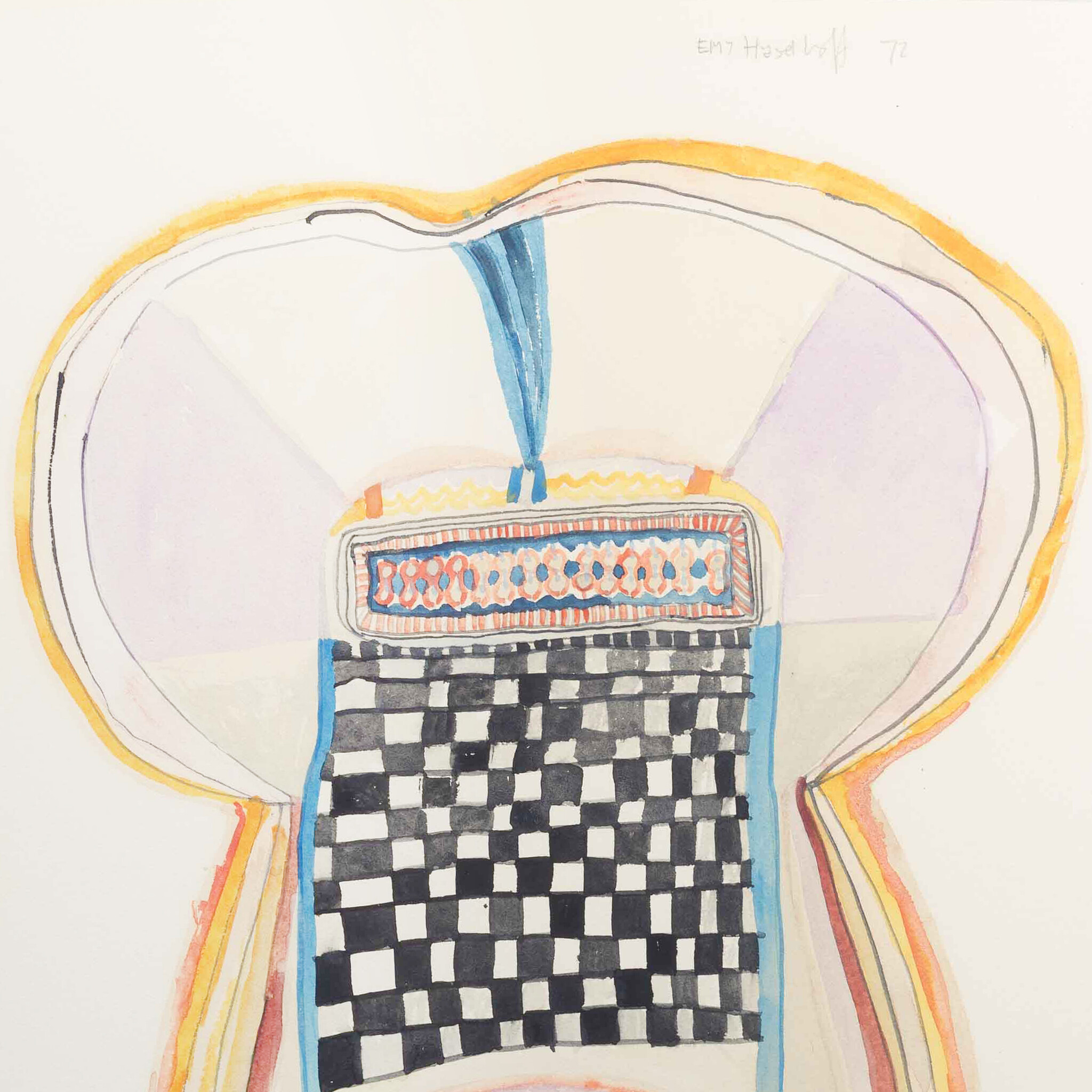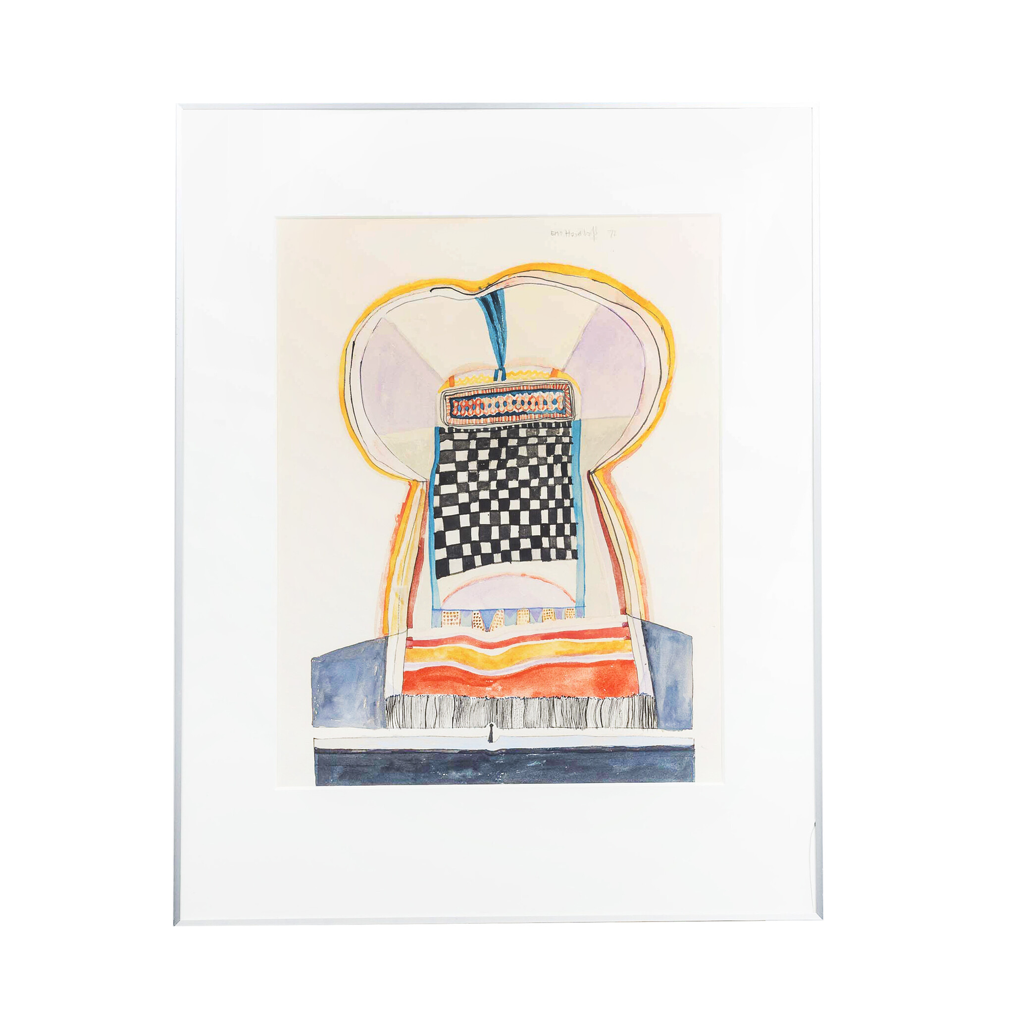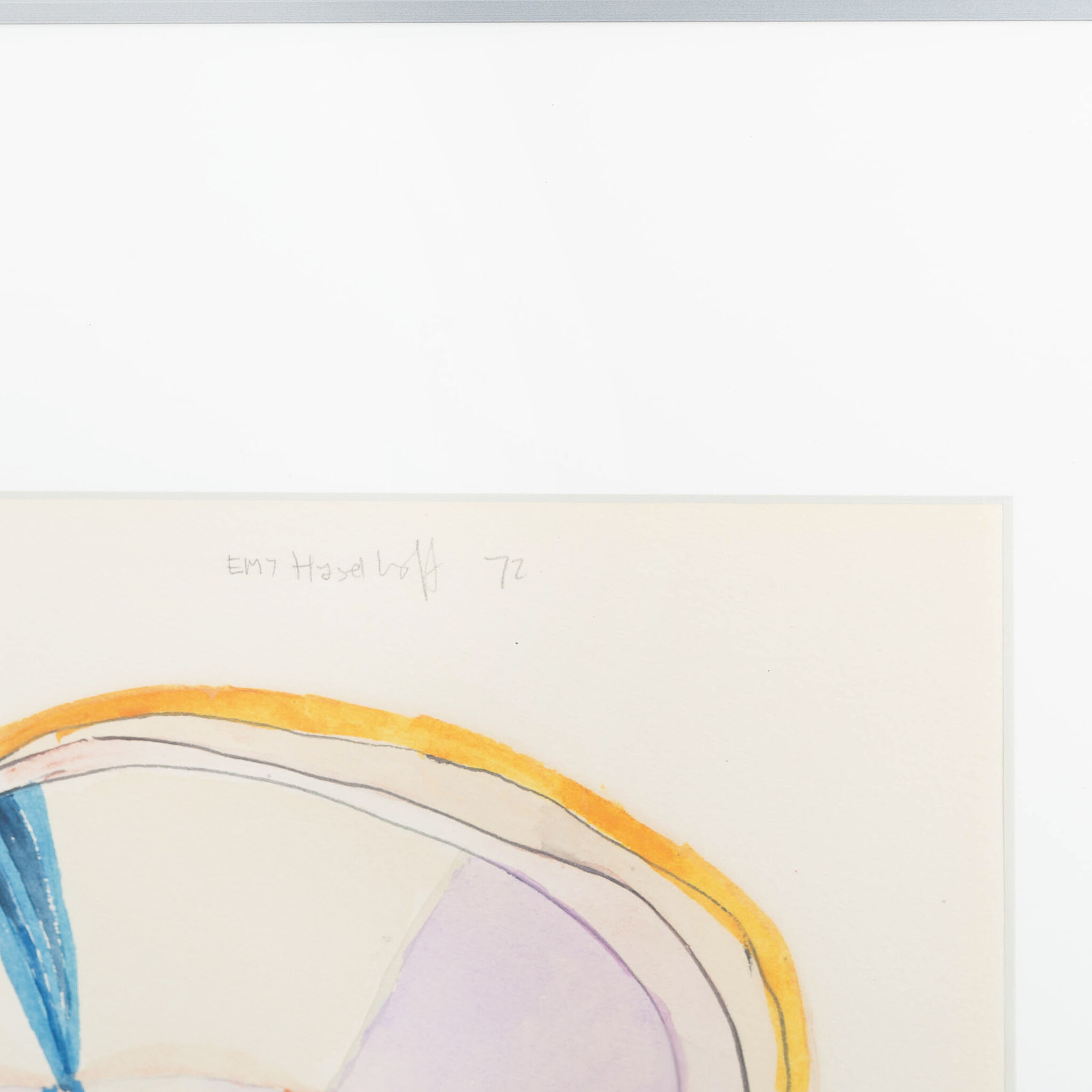 Marianne Haselhoff (Wolfheze (Renkum), 1944), 'Boterham', 1972. Gemengde technieken op papier. Afbeelding van een vorm van een boterham, ingekleurd met vlakken en lijnen in verschillende kleuren. Signatuur rechtsboven. Conditie: papier is verkleurd, beschadigingen aan lijst, glas rechtsonder is kapot. Afmetingen: beeldvlak 48 x 38,5 cm; lijst 69,5 x 56,5 cm.