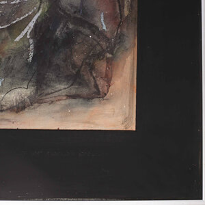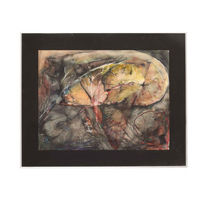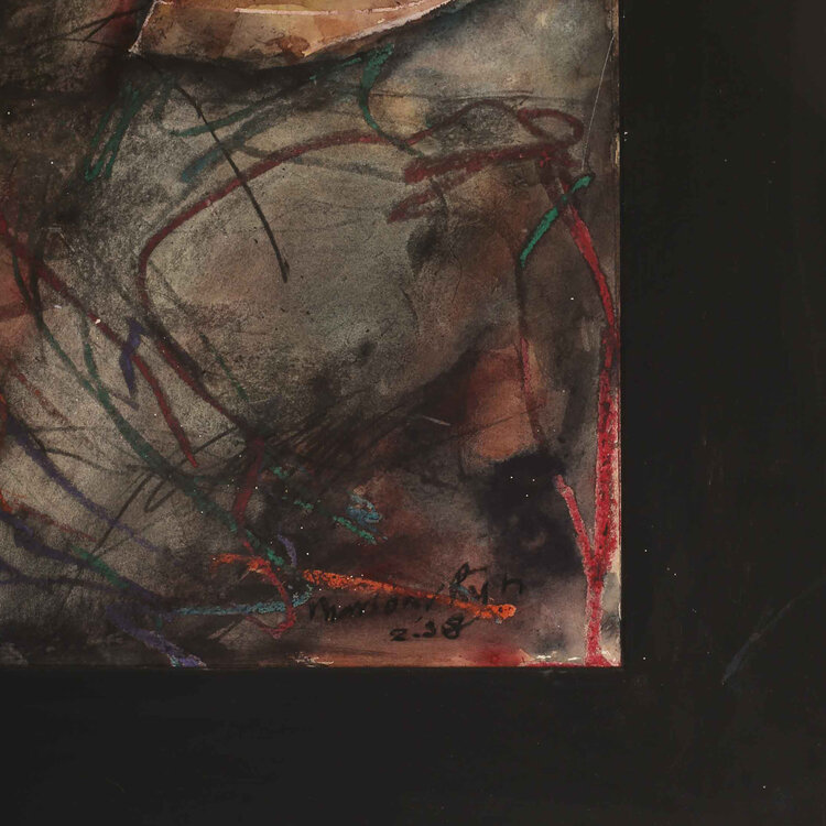 Marion van Rijn, Gegeven wijsheid, 1998. Aquarel en oliepastel op papier in metalen lijst. Abstracte compositie in donkere kleuren, met lichte accenten in wit, rood en geel. Handtekening rechtsonder. Conditie: gebruikssporen aan lijst en glas mist. Afmeting lijst: 66 x 80 cm.