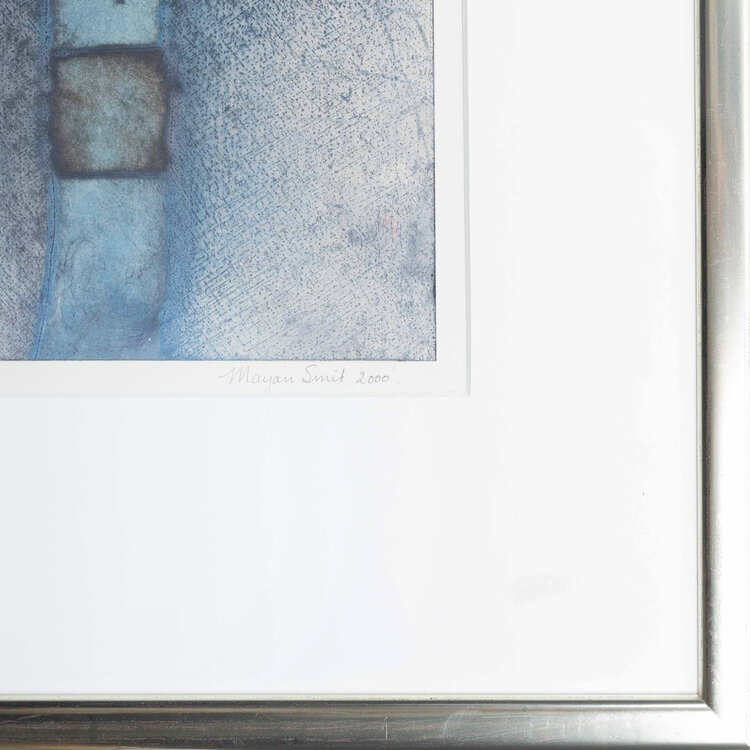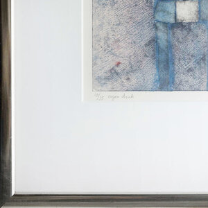 Marjan Smit, 'Compositie', 2000. Ets in metalen lijst oplage 10/35. Afbeelding van een rood gebouw met aan weerszijde een blauw geblokte toren. Links een bal in de lucht. Signatuur rechtsonder. Conditie: goed. De lijst heeft enkele lichte gebruikssporen. Afmeting lijst: 75,5 x 87,5 cm.