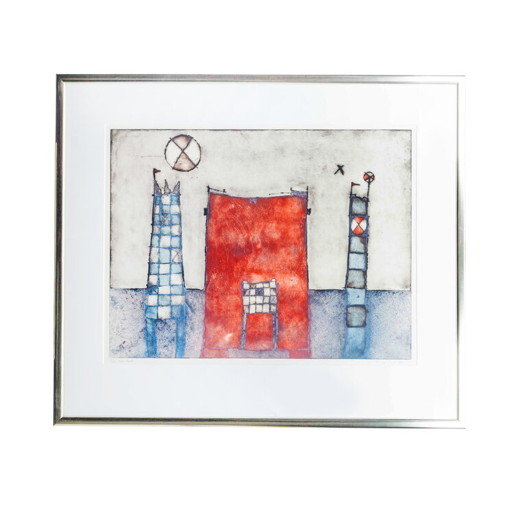 Marjan Smit, 'Compositie', 2000. Ets in metalen lijst oplage 10/35. Afbeelding van een rood gebouw met aan weerszijde een blauw geblokte toren. Links een bal in de lucht. Signatuur rechtsonder.